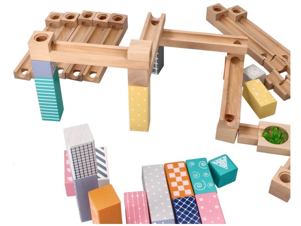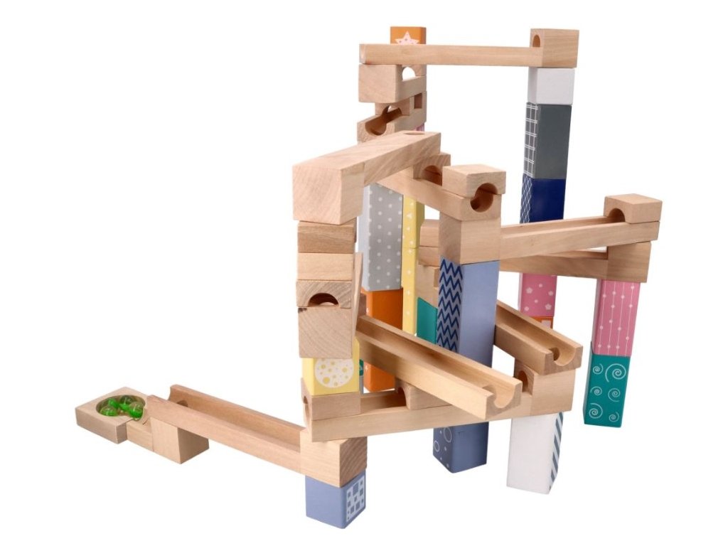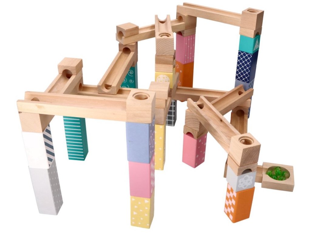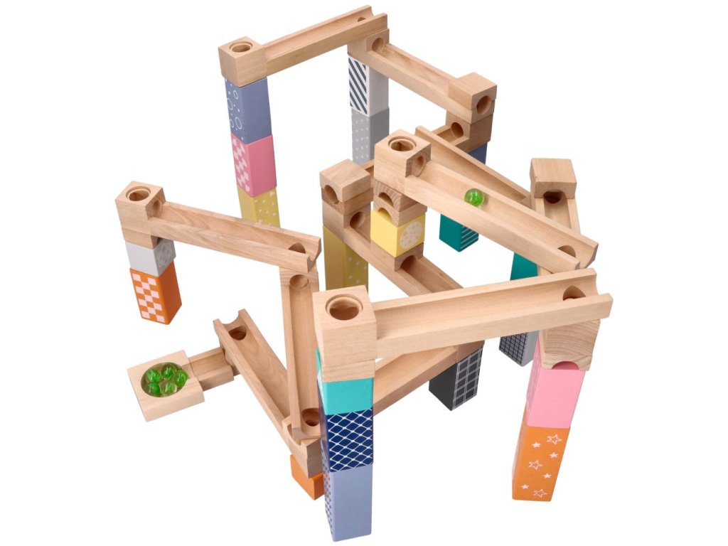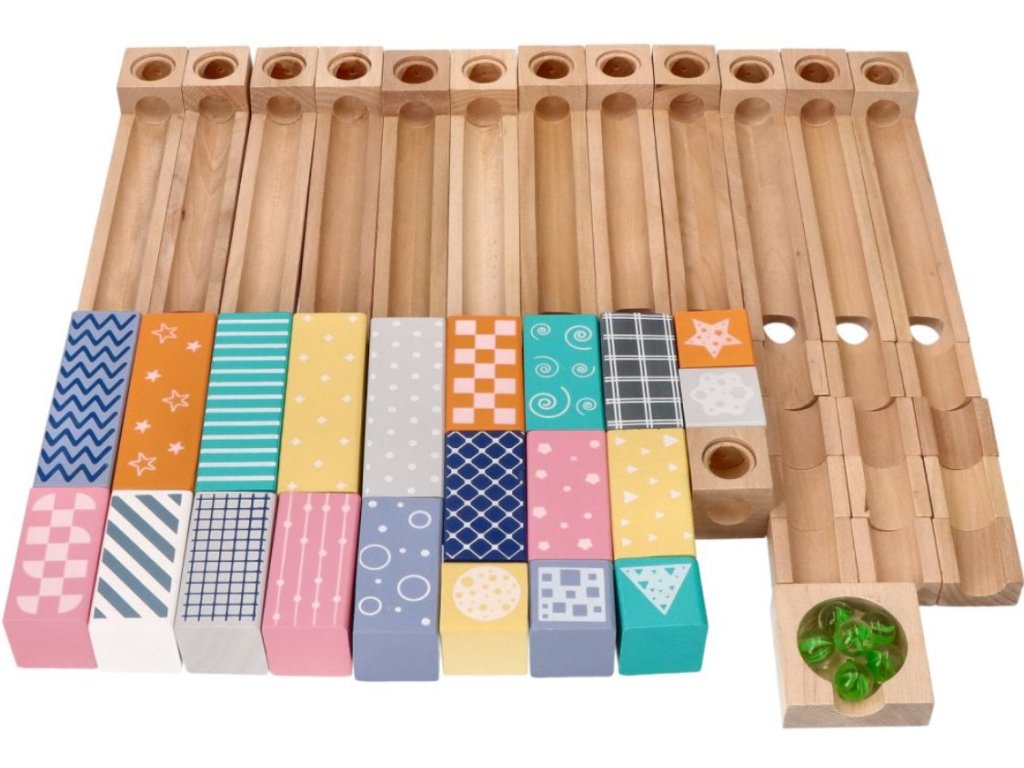 Dřevěná kuličková dráha, labyrint. Fantastická hračka pro celou rodinu, která vám umožní trávit čas společně při stavbě nových staveb. V tomto případě jsou prvky dřevěné a kuličky skleněné, což zaručuje odolnost hračky. Otestujte svou kreativitu a přitom neustále vymýšlejte nové dráhy pro řítící se kuličku. Sada obsahuje celkem 6 skleněných kuliček a 47 dřevěných prvků: - 12 drah s otvory, po kterých se koulejí kuličky. - 12 krátkých kusů pro aplikaci, tunelování atd. - 21 barevných bloků: 5 velkých, 11 středních a 5 malých. - 1 kostka s otvorem. - 1 základna na konci dráhy. Rozměry balení: 39 x 27 x 6cm. CE prohlášení o shodě.Doplňkové parametry