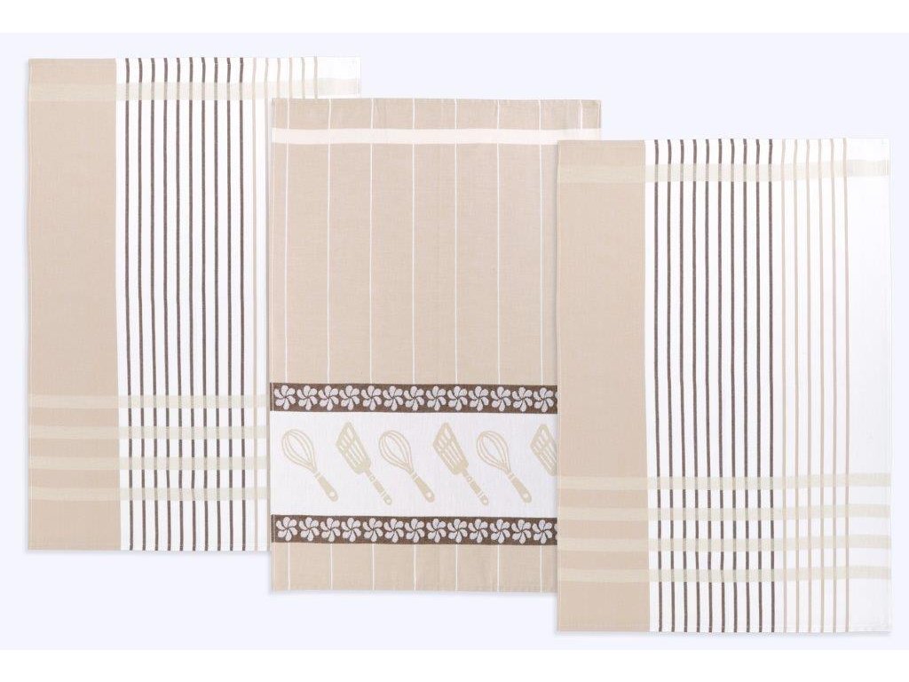 Kuchyňské utěrky jsou vyrobeny ze 100% bavlny o plošné gramáži 240g/m2. Jsou dostatečně velké a velmi dobře savé, v různých barevných variacích a dezénech. 100% bavlna zajišťuje dostatečnou savost použitého materiálu. Balení obsahuje tři kusy utěrek, barevnost utěrek může být odlišná oproti vyobrazení.