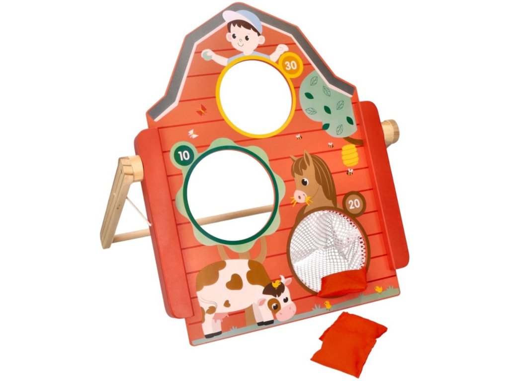 Dřevěná tabule s otvory pro vhazování. Pohybové a dovednostní hry jsou skvělým řešením, jak povzbudit děti k fyzické aktivitě. Tím, že děti povzbuzujeme ke hře a pohybu, vedeme k jejich zdravému rozvoji a práci na jejich motorice. Nespornou výhodou této hry je, že ji lze používat jak doma, tak venku. Dřevěné prkénko s motivem hospodářských zvířat děti jistě osloví a podpoří přesné hody. V této hře si budete moci vyzkoušet svůj cíl, přesnost a rychlé počítání. Stačí rozložit štít a můžete vyrazit. Štít není potřeba otáčet, stačí jej rozložit. Podpěra je upevněna na provázku, aby se při hře nerozvinula. Na desce jsou tři jamky, každá označená jiným skóre. Nestačí tedy trefit jamku, nejlepší je trefit tu s nejvyšším počtem bodů. Jedním hodem můžete získat 10, 20 nebo 30 bodů. Každý hráč má 3 hody. Sada obsahuje: -dřevěná hrací deska -tři červené vrhací pytle . Taková hračka je také příležitostí k získání nových přátel. Umístěte jej na hřiště nebo do parku a uvidíte, kolik dětí se bude chtít do hry zapojit. V jednom z otvorů je síťka na uložení tašek po hraní. Protože mají své místo, neztratí se a vždy je bude snadné najít. Věk: 3+ Rozměry štítu: 34 x 42 cm.Doplňkové parametry