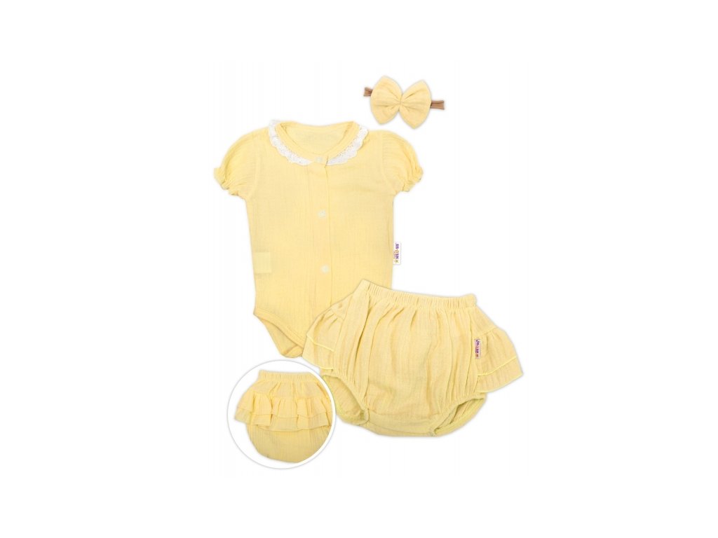 Baby Nellys 3-dílná mušelínová soupravička, body, kraťasky + čelenka GIRL, žlutá