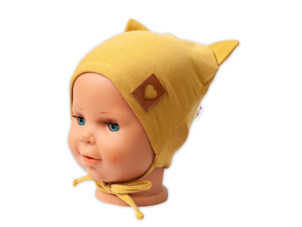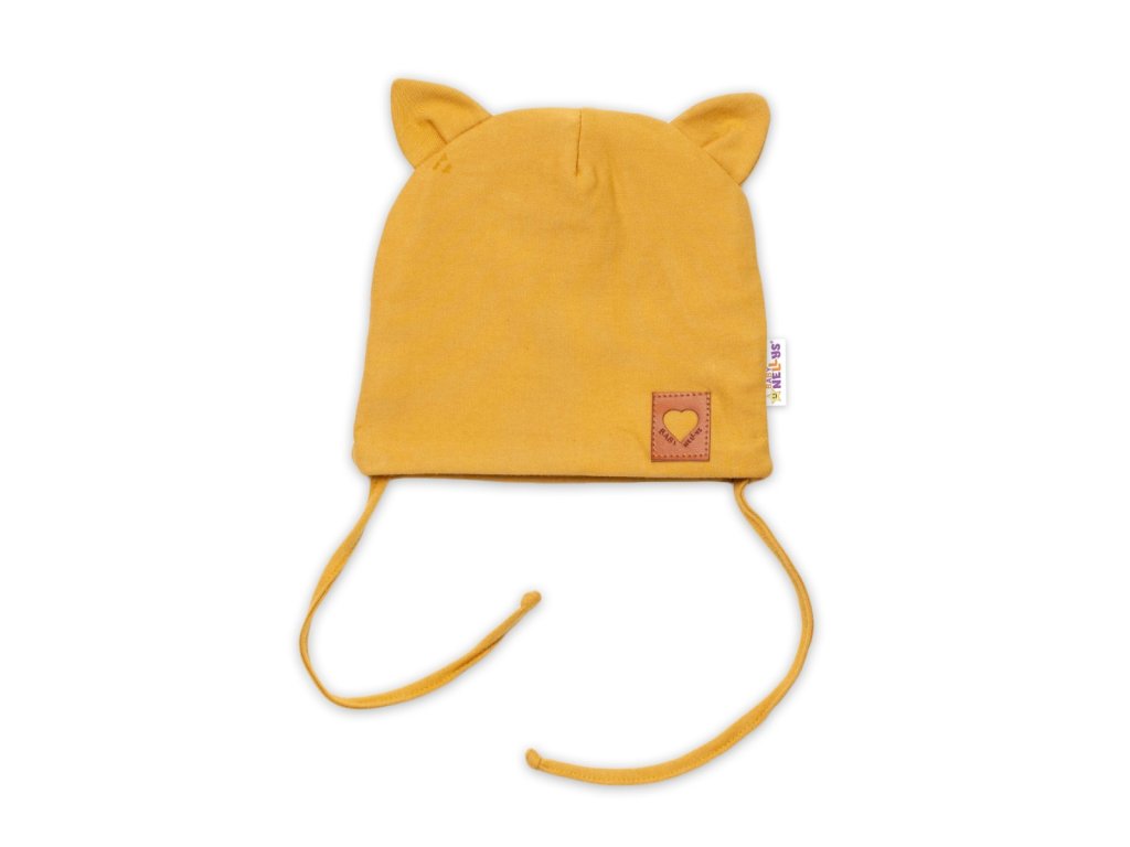 Baby Nellys Bavlněná dvouvrstvá čepice s oušky na zavazování FOX - hořčicová