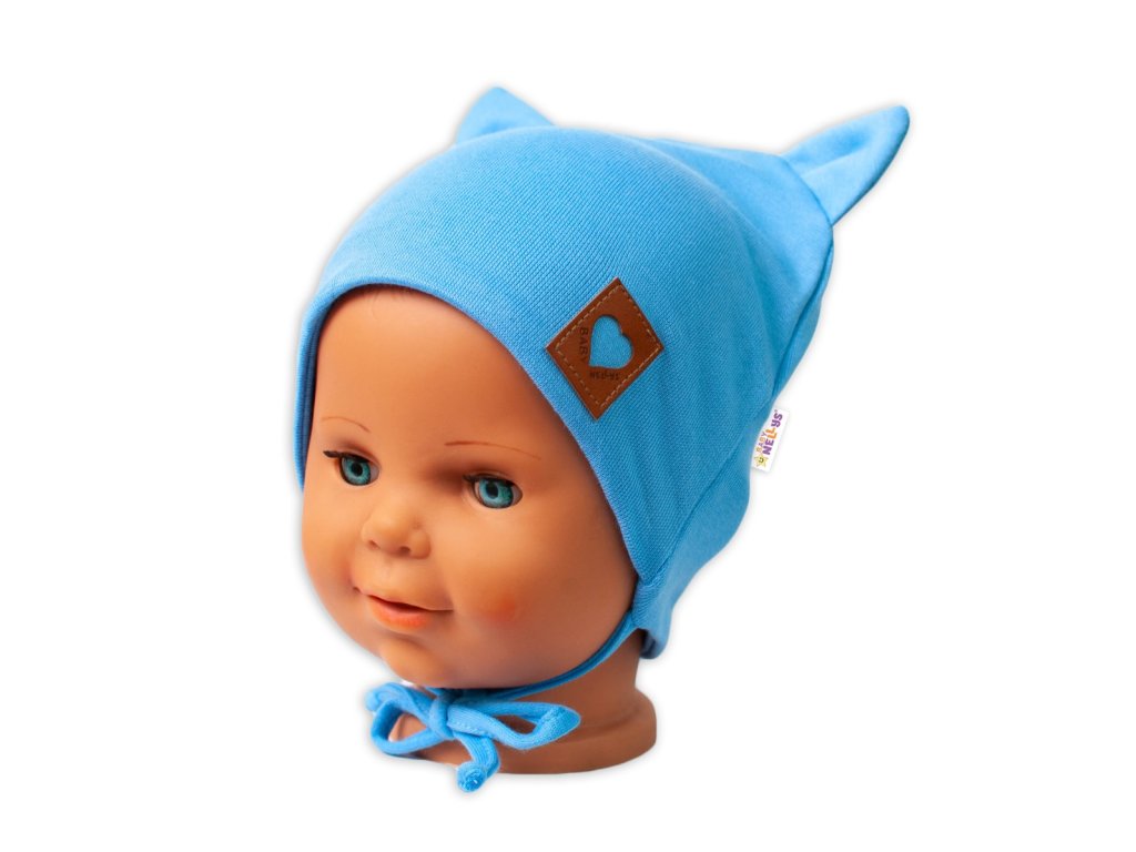 Baby Nellys Bavlněná dvouvrstvá čepice s oušky na zavazování FOX - modrá