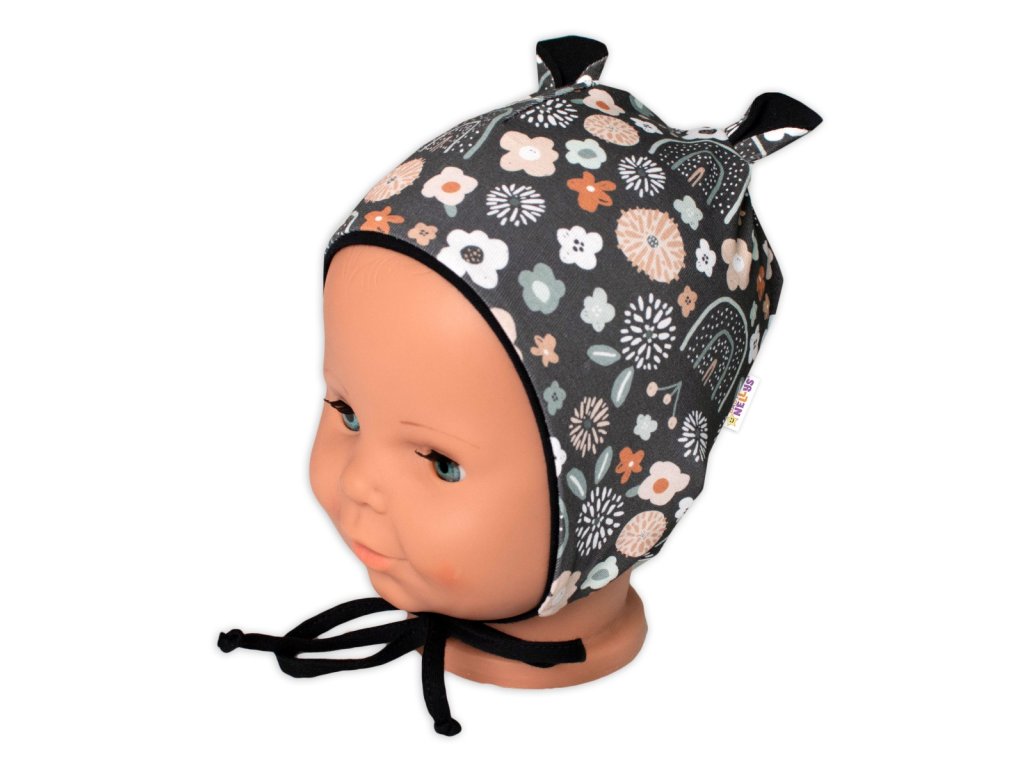 Baby Nellys Kojenecká čepička s oušky na zavazování - Palouček, grafit