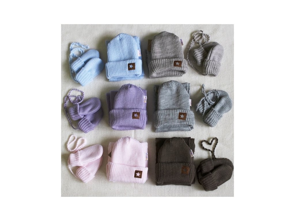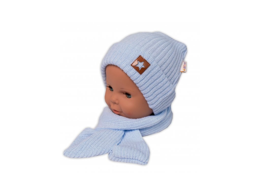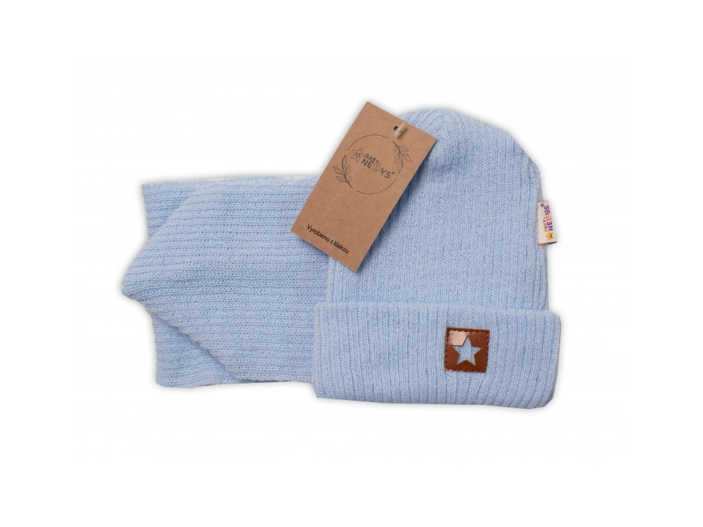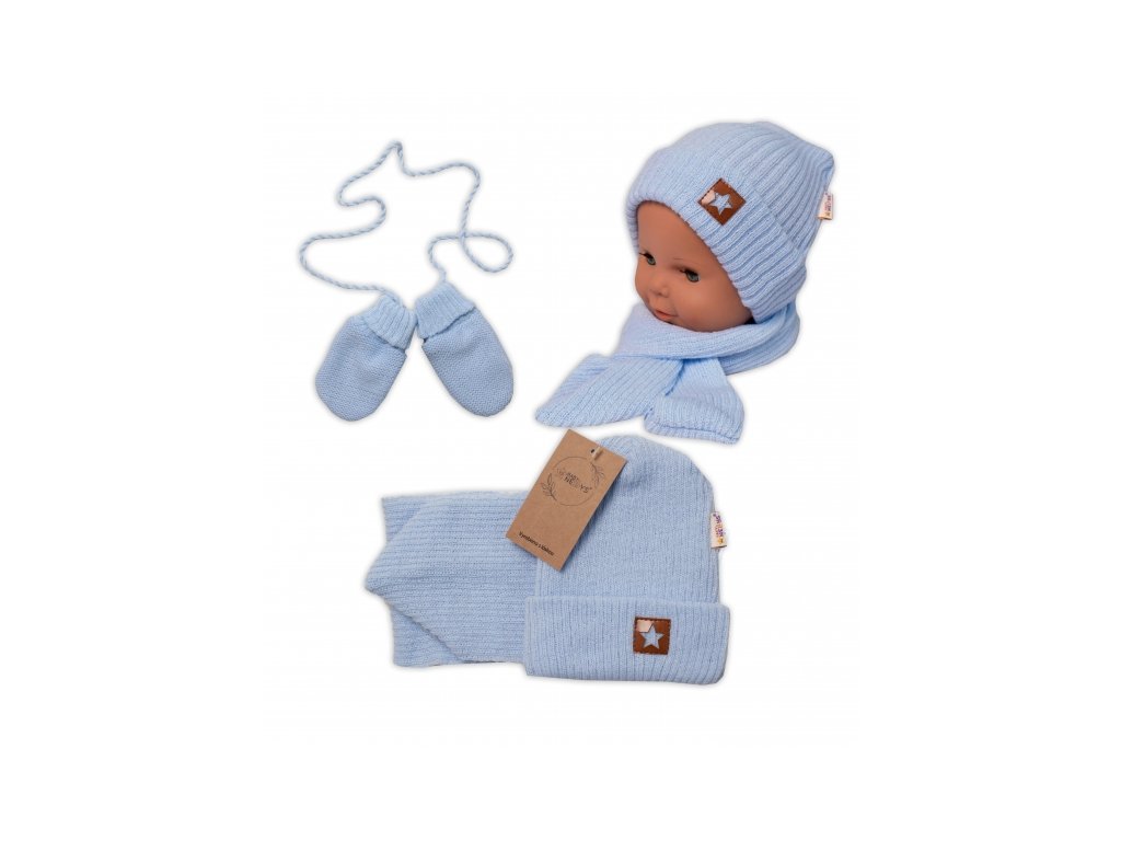 Baby Nellys Pletená čepice s šálou a rukavičky 3v1, STAR - sv. modrá