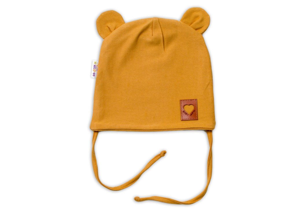 Bavlněná dvouvrstvá čepice s oušky na zavazování TEDDY - hořčicová, Baby Nellys