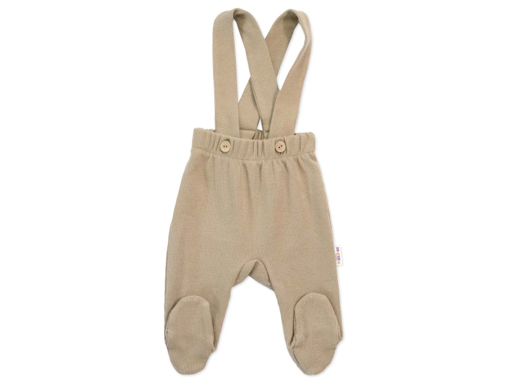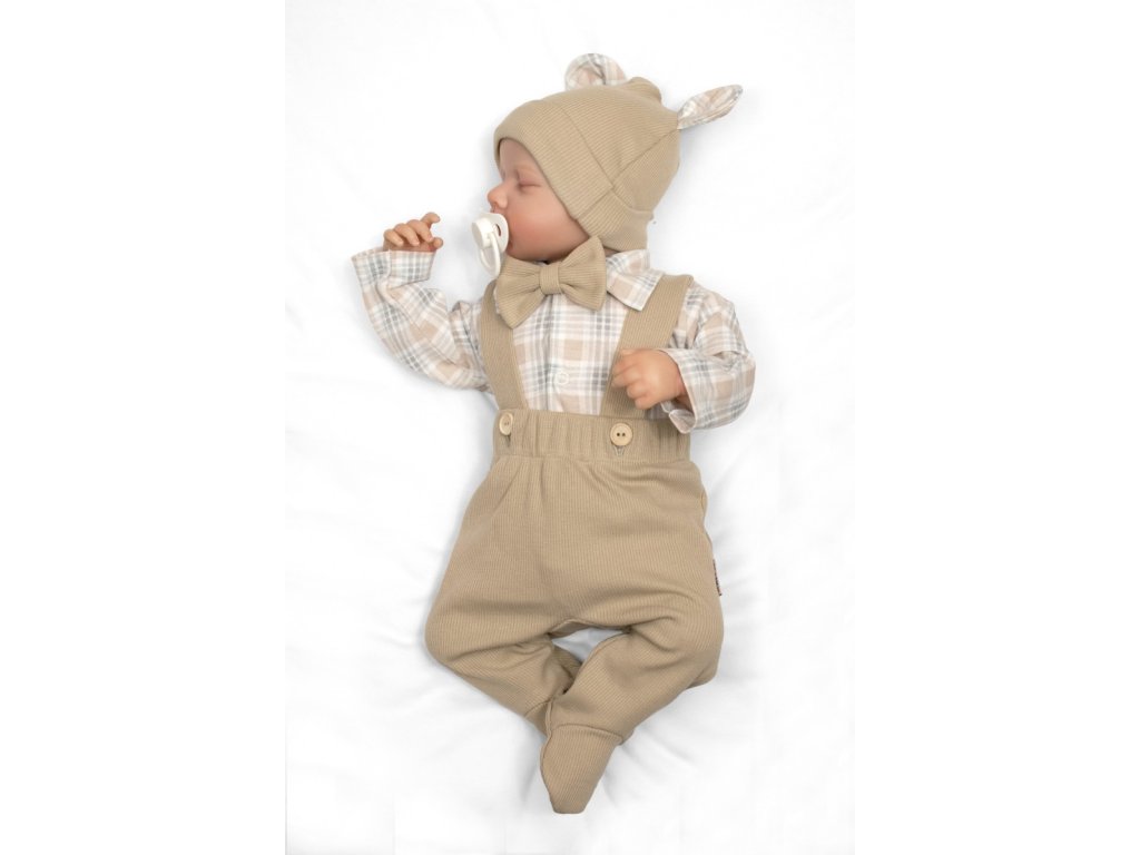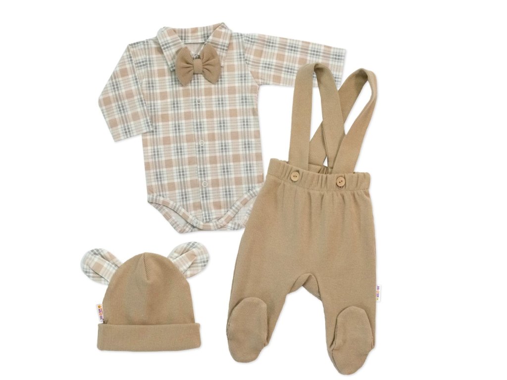 Bavlněná souprava Gentleman 3D, body, polodupačky s láclem, čepička, béžová/kostička
