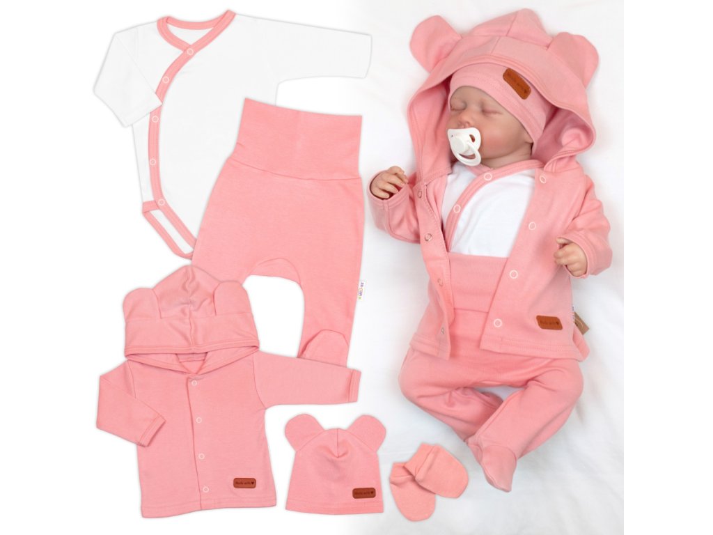Krásná bavlněná 5dílná sada pro miminko Baby Nellys ČR. Dopřejte svému miminku luxus a pohodlí s naší nádhernou 5dílnou sadou od Baby Nellys! Naše exkluzivní sada je vyrobena z prvotřídní bavlny, která je mimořádně jemná a šetrná k citlivé dětské pokožce. Tato sada je nejen krásná, ale také praktická a funkční. Co sada obsahuje: Bavlněná mikina s kapucí a oušky: Mikina, která udrží vaše miminko v teple a zároveň vypadá neodolatelně roztomile díky ouškům na kapuci. Kapuce je dvouvrstvá. Polodupačky se širokým pasem: Polodupačky s širokým pasem, který netlačí a zajišťuje maximální pohodlí a volnost pohybu pro vaše miminko. Zavinovací body rozepnuté po celé délce: Praktické zavinovací body, které usnadňuje oblékání a přebalování díky rozepínání po celé délce. Čepička s oušky: Roztomilá čepička s oušky, která chrání hlavičku miminka před chladem a zároveň dokonale doplňuje celý outfit. Kojenecké rukavičky: Jemné rukavičky, které chrání vaše miminko před poškrábáním a dodávají mu pocit bezpečí. Detailní rozměry: Velikost 50: Polodupačky: celková délka od pasu k patě 25 cm, šířka pasu 16 x 2 cm. Kabátek: celková délka od krku 23,5 cm, šířka pod pažemi 20 x 2 cm, délka rukávu 15 cm. Body: celková délka od krku 30,5 cm, hrudník - 17 x 2 cm, délka rukávu 13 cm. Čepička: hloubka 11 cm, obvod - 13 x 2 cm. Velikost 56: Polodupačky: celková délka od pasu k patě 29 cm, šířka pasu 17 x 2 cm. Kabátek: celková délka od krku 25,5 cm, šířka pod pažemi 21 x 2 cm, délka rukávu 16 cm. Body: celková délka od krku 32,5 cm, hrudník - 18 x 2 cm, délka rukávu 14 cm. Čepička: hloubka 13 cm, obvod - 15 x 2 cm. Velikost 62: Polodupačky: celková délka od pasu k patě 33 cm, šířka pasu 18 x 2 cm. Kabátek: celková délka od krku 27,5 cm, šířka pod pažemi 23 x 2 cm, délka rukávu 17 cm. Body: celková délka od krku 35 cm, hrudník - 19 x 2 cm, délka rukávu 15 cm. Čepička: hloubka 15 cm, obvod - 17 x 2 cm. Proč zvolit právě tuto sadu? 100% bavlna: Materiál, který je přirozeně měkký, prodyšný a ideální pro citlivou dětskou pokožku. Baby Nellys: Česká rodinná značka, která garantuje nejvyšší kvalitu a spokojenost zákazníků. Perfektní dárek: Skvělá volba jako dárek pro novopečené rodiče, který potěší svou krásou a praktičností. Zvolte kvalitu a pohodlí pro své miminko s Baby Nellys! Objednejte nyní a dopřejte svému děťátku to nejlepší!Doplňkové parametry