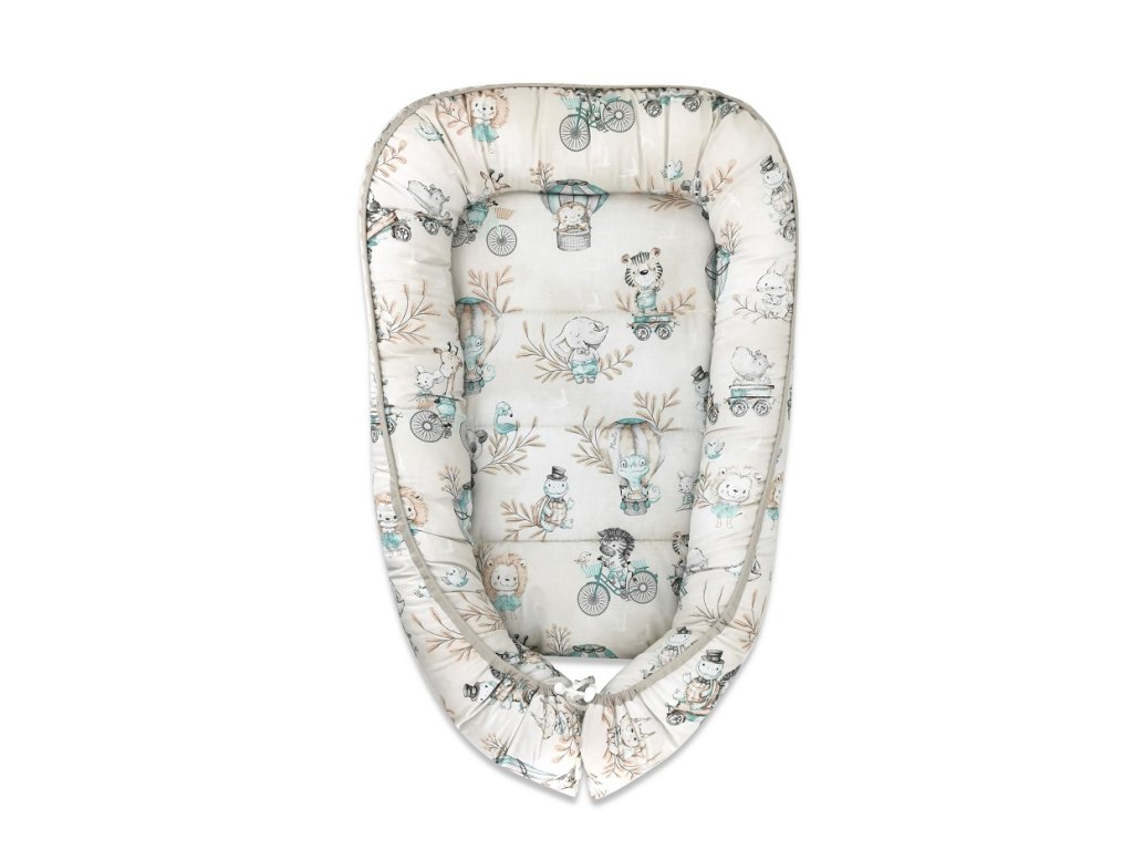 Bavlněné oboustranné hnízdečko, 55 x 75 cm, ZOO na cestách - cappuccino/mátová