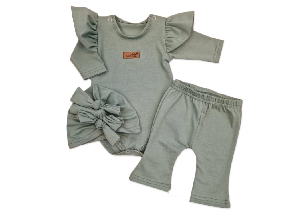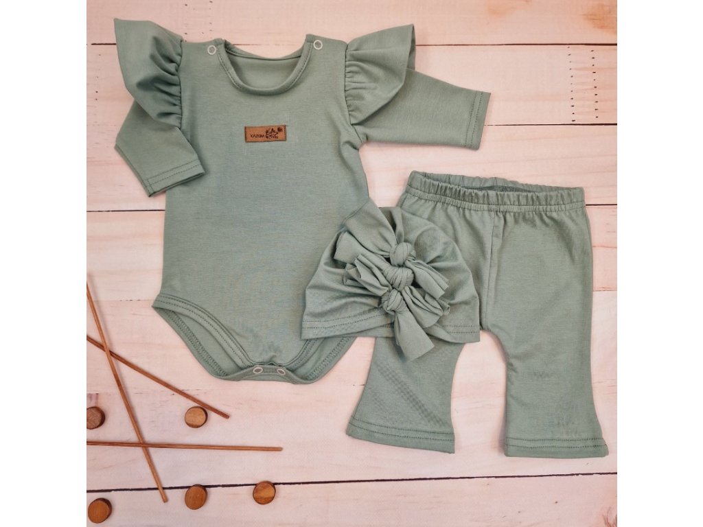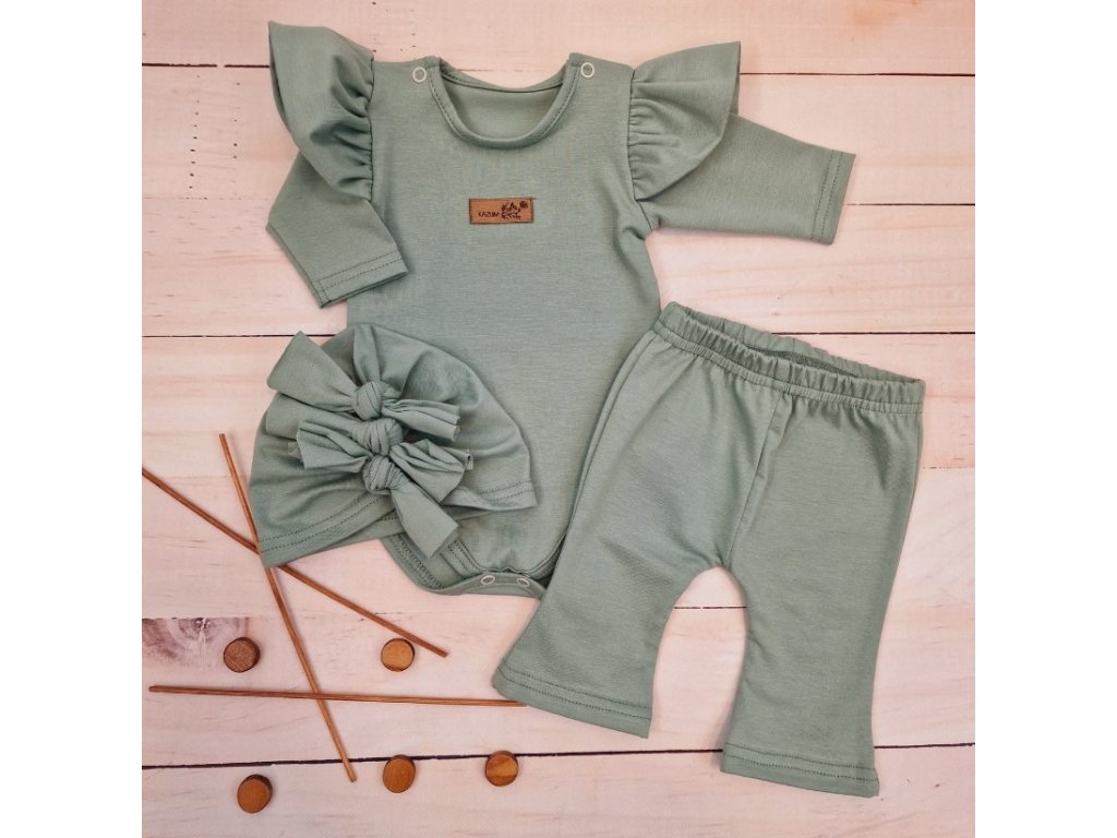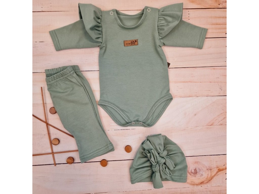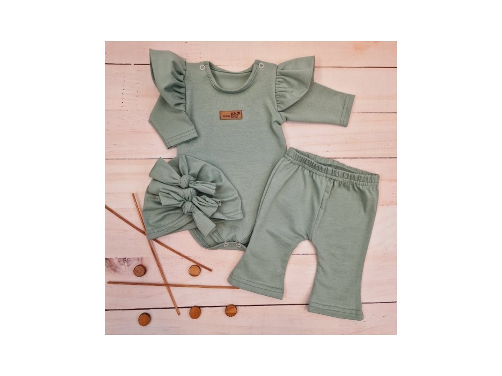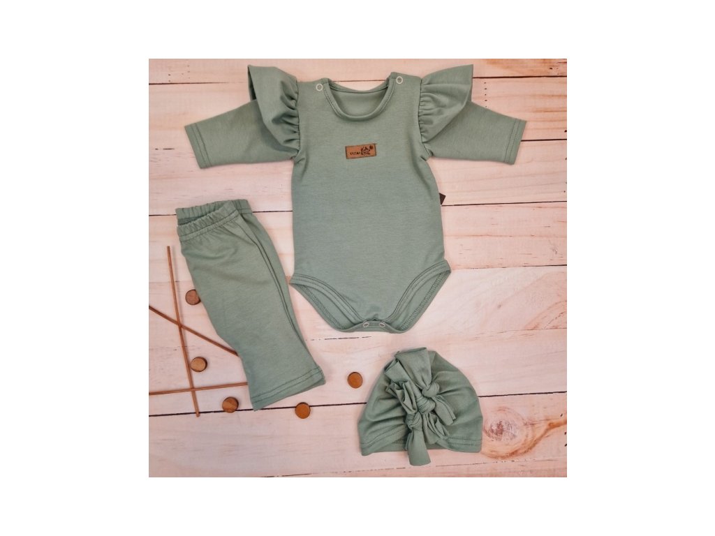 Body s volánky, legíny do zvonu a čepička, 3D, bavlna, olivová