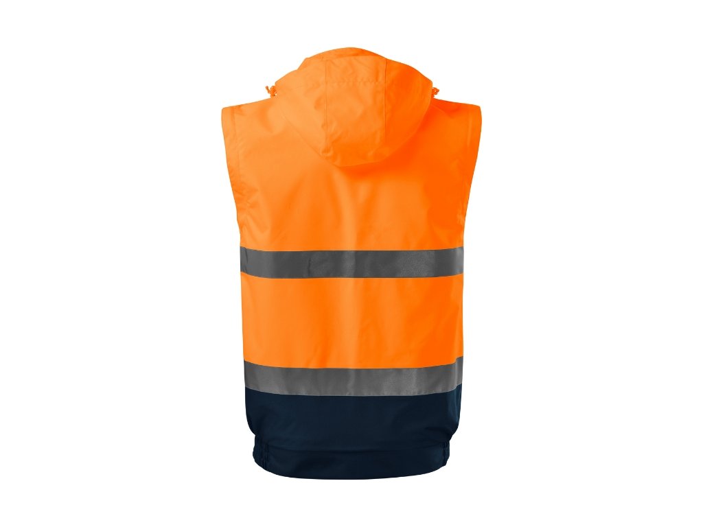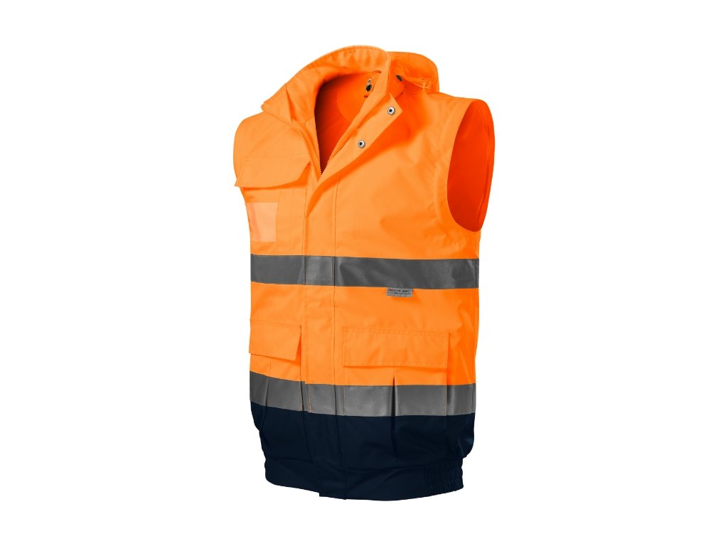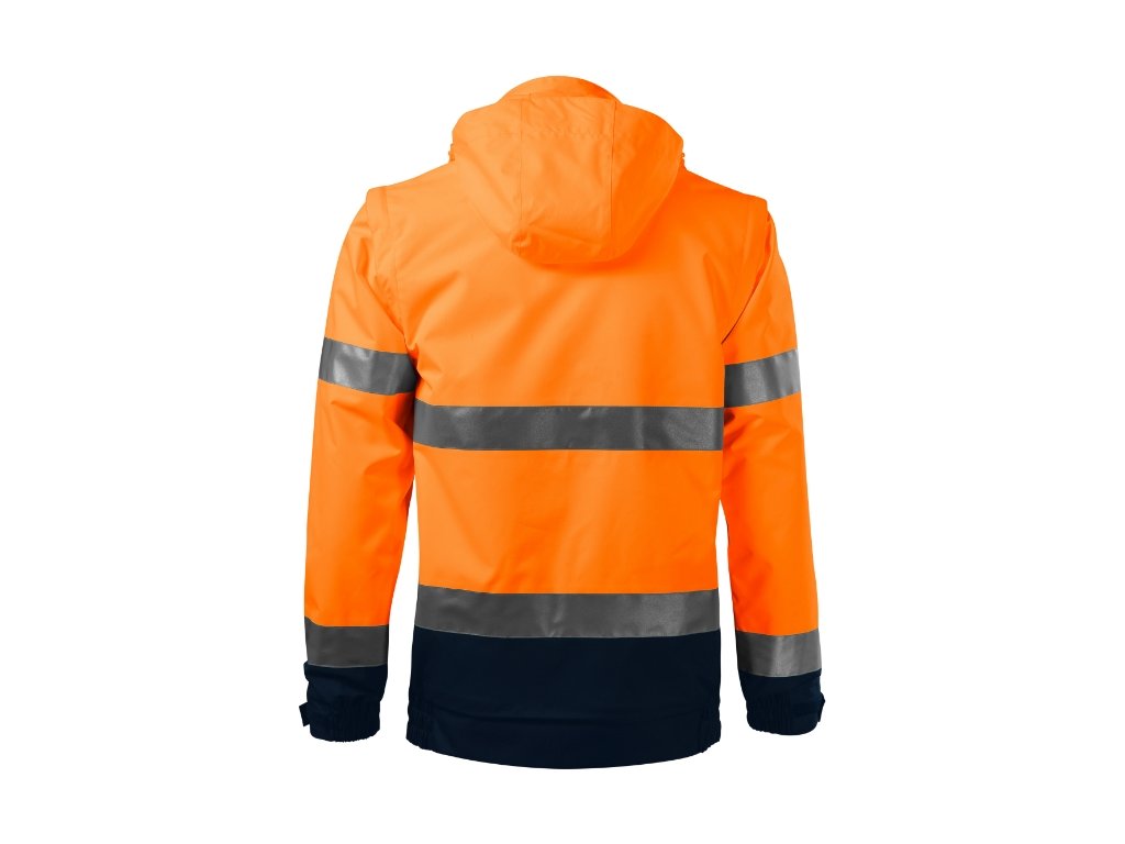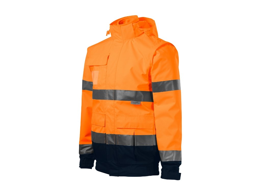 oděv s vysokou viditelností víceúčelové použití 4 v 1 v dvoubarevném provedení Svrchní bunda: voděodolný, prodyšný, fluorescenční materiál certifikované retroreflexní pruhy 3M celopropínací kostěný zip s klopou odnímatelná kapuce s vyztuženým kšiltem, skrytá v límci kapuce a dolní lem na stažení elastickou šňůrkou odnímatelné rukávy lemy rukávů stažené pruženkou, nastavitelné suchým zipem měchové kapsy s klopou a boční kapsy náprsní kapsa na zip s klopou kapsa na ID kartu a propisky podlepené švy vstup pro branding v podšívce zadního dílu certifikace dle norem EN ISO 20471/A1 (třída 3, 1), EN 343 (třída 4:1) a EN ISO 13688 Vnitřní fleece: odnímatelná vnitřní fleecová bunda hřejivý fluorescenční materiál certifikované retroreflexní pruhy 3M celopropínací kostěný zip kapsy s kostěným zipem lemování elastickým proužkem antipilingová úprava z obou stran certifikace dle norem EN ISO 20471/A1 (třída 2) a EN ISO 13688Svrchní bunda: Oxford, 100 % polyester s PU úpravou, retroreflexní pruhy 3M, 210 g/m² Vnitřní bunda: Fleece, 100 % polyester, antipilingová úprava z obou stran, retroreflexní pruhy 3M, 280 g/m²