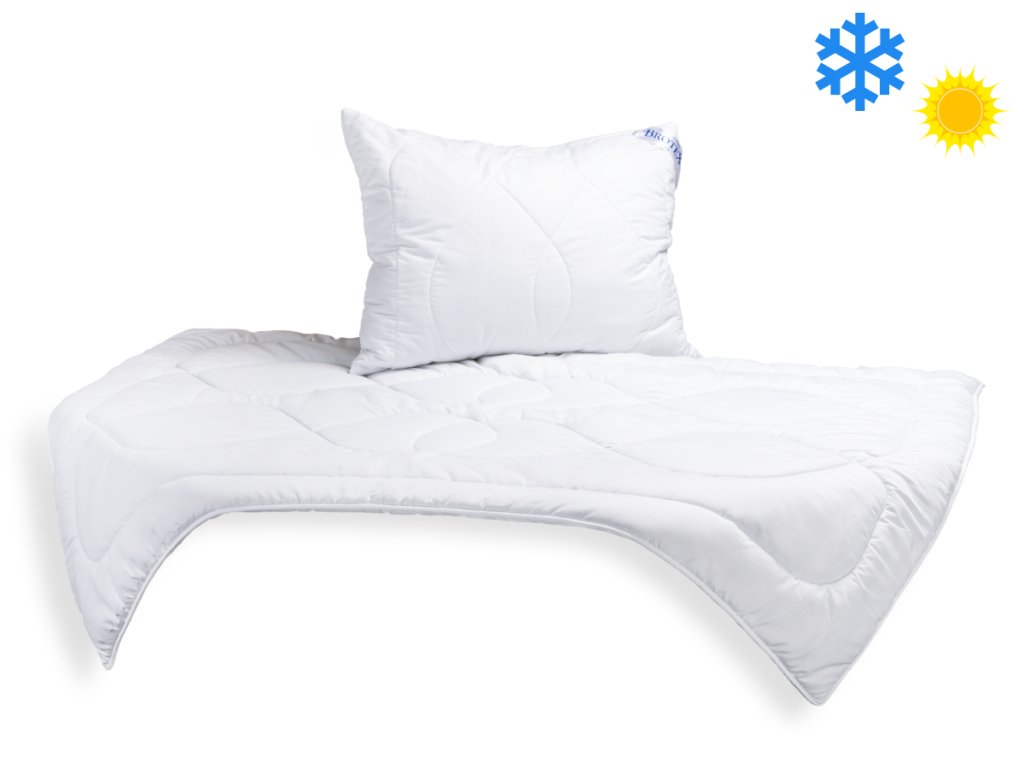 Souprava LUXUS PLUS obsahuje přikrývku 140x200 cm o gramáži vnitřního výplňového materiálu 850g a polštář 70x90cm s výplní 700g kuličkového vlákna. Přikrývka je vhodná pro jarní a podzimní období nebo pro celoroční užívání. Polštář je opatřen zipem, pro možnost doplnění či odebrání části výplně dle potřeby zákazníka. Přikrývka i polštář obsahují plně protialergické duté vlákno.