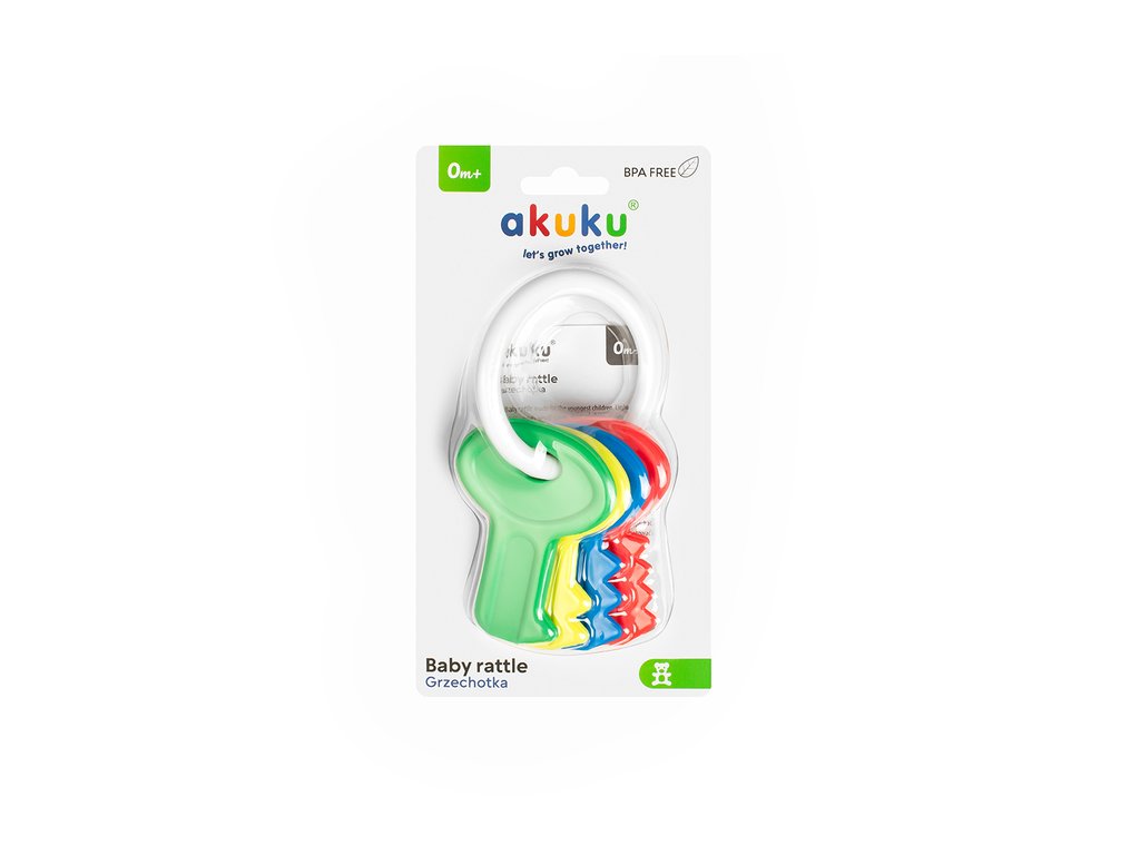 Chrastítko pro miminko Akuku. Chrastítko je ideální první hračkou pro miminko, protože je lehké a snadno uchopitelné. Dítě ji může snadno chytit a držet v ručičkách. Má jemně zaoblené tvary. Hračka motivuje dítě k pohybu a hře, čímž stimuluje jeho psychomotorický vývoj. Určeno pro děti ve věku 0m+. Pokyny: Hračku udržujte v čistotě. Před prvním použitím chrastítko přelijte vařící vodou. Nevařte ji ani nedezinfikujte. Pro zachování hygieny pravidelně omývejte chrastítko jemným prostředkem, důkladně opláchněte a nechte vyschnout. Výrobce: Albis Mazur sp. z o.o., Chotów 24a 63-460, Nowe Skalmierzyce., info@akuku.eu. Upozornění: Nenechávejte dítě samo bez dozoru. Obal není hračka, odstraňte ho z dosahu dítěte.Doplňkové parametry