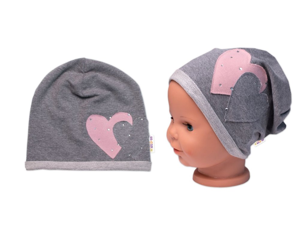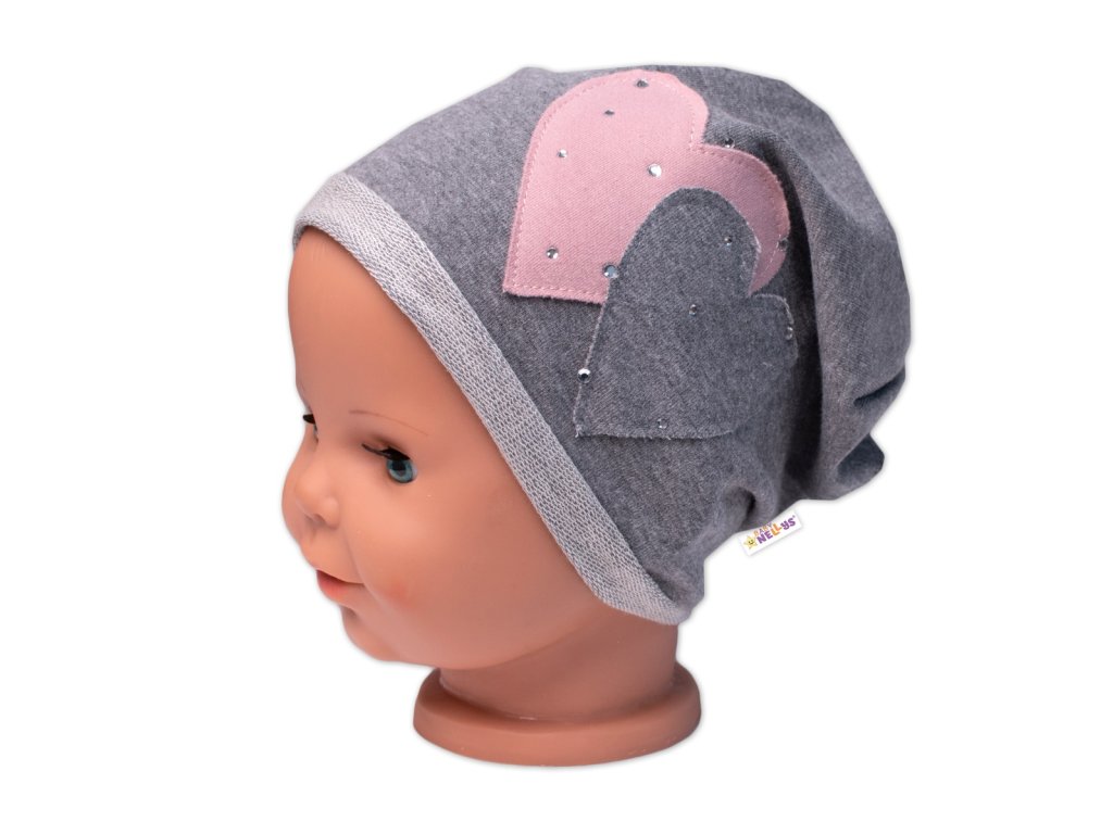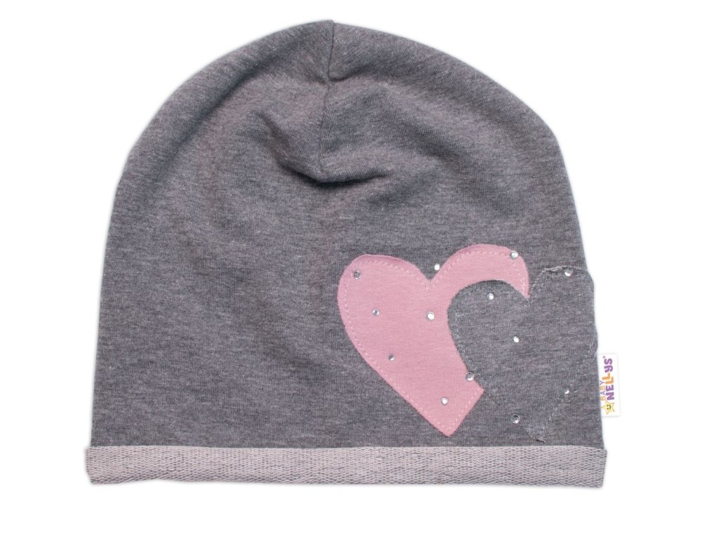 Dětská čepice bavlna, Srdíčka s kamínky, Baby Nellys, šedá