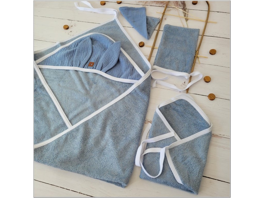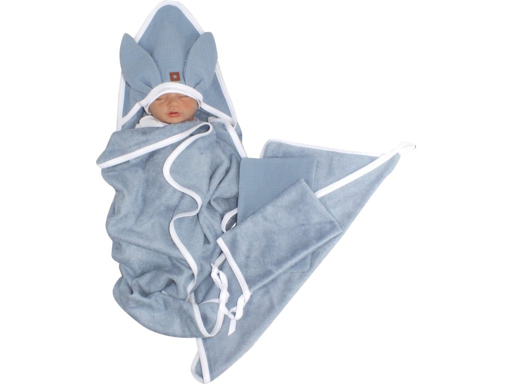 Dětská luxusní 4D bambusová sada - osuška s kapucí a ručníkem + 2 žinky, modrá