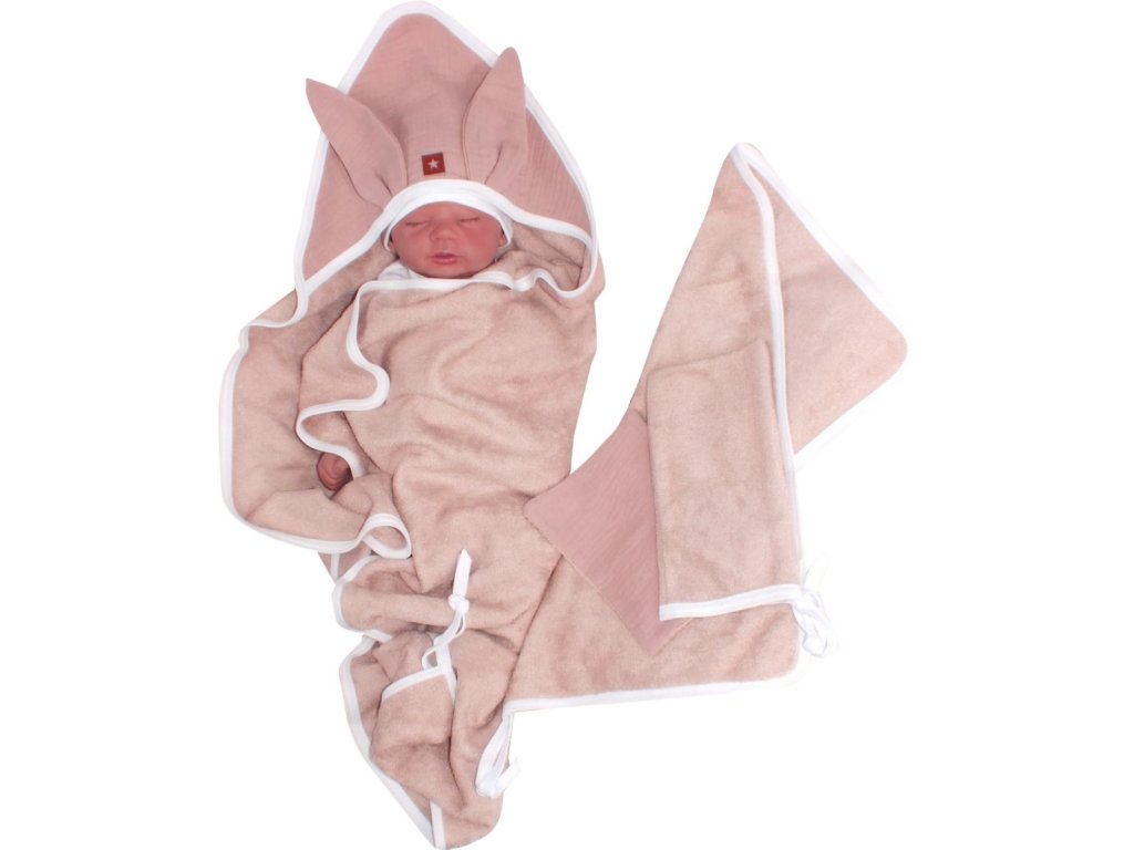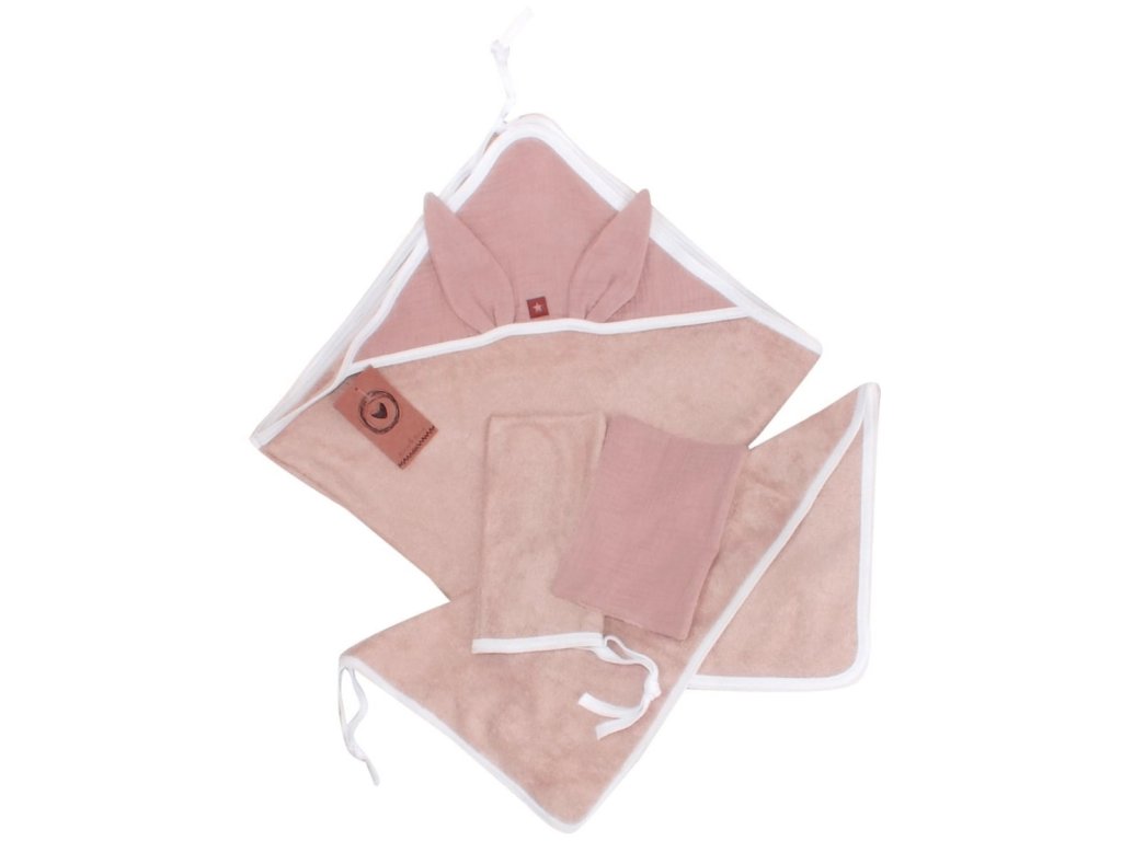 Luxusní koupací set pro novorozence a kojence. Sada obsahuje: Osušku s kapucí. Ručník. 2ks žínek. Set je velmi praktický a pomůže Vám postarat se o každodenní hygienu děťátka. Materiál: 90% bambus 10% polyester, mušelínová část: 100% bavlna. Bambusová osuška je mimořádně příjemná na dotek a šetrná k jemné dětské pokožce. Rozměry: Osuška: 78 x 78 cm. Ručník: 48 x 30 cm. Žinky: 21 x 12 a 18 x 12 cm.Doplňkové parametry
