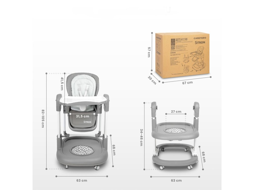 Dětská židlička Sitron 3v1 s funkcí houpačky a chodítka. Křesílko 3v1. Je ideálním řešením pro rodiče, kteří hledají praktický, prostorově úsporný a multifunkční produkt. Jeden výrobek nabízí hned tři klíčové funkce. Doprovází dítě od prvních měsíců až po období, kdy objevuje svět samostatně. Židlička je určena pro děti od 6 do 36 měsíců s maximální nosností 15 kg. Bezpečnost na prvním místě. Vaše dítě bude vždy v bezpečí díky pásům, které jej pevně udrží v sedací části. Kolečka s brzdou zajišťují stabilitu. Zaoblené hrany minimalizují riziko poranění a zvyšují komfort i bezpečnost. Houpačka pro nejmenší. Židličku lze snadno přeměnit na bezpečnou houpačku, která nabízí jemné a příjemné houpání. Skvěle se hodí pro odpočinek, usínání i hraní. Zároveň podporuje správný vývoj dítěte. Židlička na krmení. Praktická dvojitá odnímatelná jídelní tác usnadňuje čištění po jídle. Nastavitelná výška umožňuje přizpůsobení k jídelnímu stolu. Pásy a měkká vložka zajistí pohodlné a stabilní sezení. Snadno omyvatelný potah šetří váš čas při úklidu. Chodítko pro bezpečné první krůčky. Díky funkci chodítka dítě bezpečně trénuje chůzi. Stabilní konstrukce a zaoblené rohy chrání před zraněním. Výškově nastavitelná konstrukce se přizpůsobí růstu dítěte. Integrovaný tác navíc nabízí prostor pro hračky, svačinu i učení. Snadná regulace a pohodlí. Opěrku lze nastavit do 4 poloh, což je ideální jak při krmení, tak při relaxaci. Sedací část má 5 stupňů nastavení výšky, aby dokonale seděla ke každému stolu. Nastavitelná vzdálenost tácu poskytne dítěti více pohodlí a volnosti během jídla. Technické parametry. Židlička: výška 82–105 cm, šířka 63 cm. Sedadlo: hloubka 23 cm, šířka 31,5 cm, výška opěrky 41,5 cm, vzdálenost tácu max. 28 cm. Chodítko: průměr 27 cm, výška 34–46 cm, šířka 63 cm, hloubka 68 cm. Hmotnost: netto 13,5 kg / brutto 14,5 kg. Upozornění. Výrobek je určen pouze pro děti od 6 měsíců do 36 měsíců a do maximální hmotnosti 15 kg. Používejte vždy pod dohledem dospělé osoby. Nenechávejte dítě bez dozoru. Před použitím vždy zkontrolujte stabilitu a správné upevnění všech částí. Výrobek odpovídá platným normám EU a má potřebnou certifikaci CE.Doplňkové parametry
