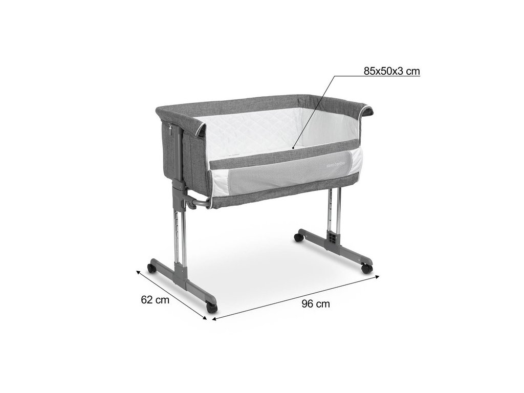 Sleep2gether – Multifunkční postýlka 2v1 pro blízkost a pohodlí. Sleep2gether je inovativní postýlka navržená pro zajištění blízkosti mezi rodiči a jejich novorozencem. Může sloužit jako samostatná postýlka, ale její pravý potenciál se projeví po demontáži přední stěny, kdy ji lze přistavit k posteli rodičů. Tím se noční krmení a péče o dítě stanou mnohem pohodlnějšími, protože nemusíte vstávat z postele. S 7stupňovou regulací výšky, vestavěnými kolečky s brzdou a nastavitelnými nohami lze postýlku snadno přizpůsobit téměř jakékoli posteli. Součástí balení je pohodlná matrace se zpevněným podkladem a popruhy pro připevnění Sleep2gether k posteli rodičů. Elegantní design spojuje nadčasovou šedou barvu s jemnou prošívanou látkou uvnitř postýlky. Klíčové vlastnosti: Vhodné pro děti od narození do 6 měsíců (maximální hmotnost 9 kg nebo do doby, kdy dítě začne sedět). Intuitivní skládání a rozkládání pro snadné používání. 2v1 funkce: samostatná postýlka a přístavná postýlka k rodičovské posteli. Snadné krmení a péče bez nutnosti vstávání z postele. Otevírací přední stěna s bezpečnostní pojistkou. Pěnová matrace se zpevněním v ceně. 7 výškových poloh pro přizpůsobení postýlky k rodičovské posteli. Možnost naklonění postýlky pro snadnější uspávání a prevenci ublinkávání. Nastavitelná vzdálenost nohou od rodičovské postele. Upevňovací popruhy pro bezpečné připojení k rodičovské posteli. Stylový design v kombinaci nadčasové šedé barvy a jemné prošívané látky. Vyrobeno z odolné polyesterové tkaniny, snadno udržovatelné v čistotě. Splňuje evropskou normu EN 1130:2001 pro bezpečnost dětských postýlek. Technické údaje: Celkové rozměry: 96x62x62-84 cm. Výška k okraji matrace: 32-54 cm Matrace: 85x50x3 cm Vnitřní rozměry: 85x50x32 cm. Rozměry balení: 64x16x96 cm. Zvolte Sleep2gether pro klidné a pohodlné noci s vaším novorozencem, a užijte si bezstarostné a blízké chvíle plné lásky a péče.Doplňkové parametry