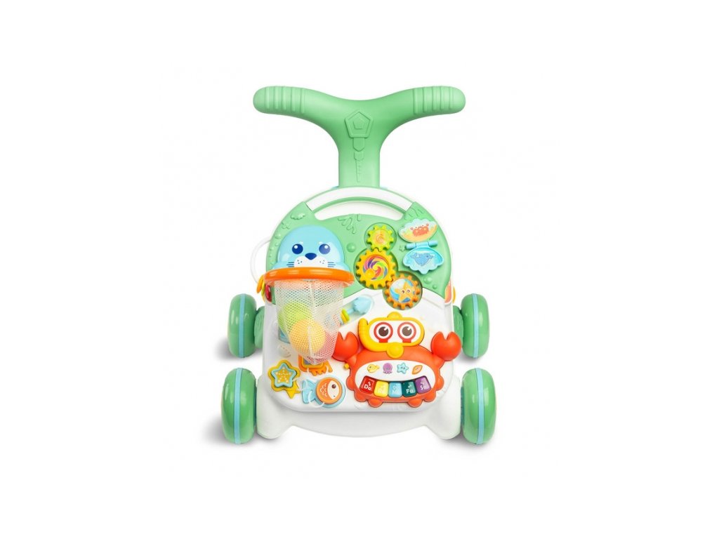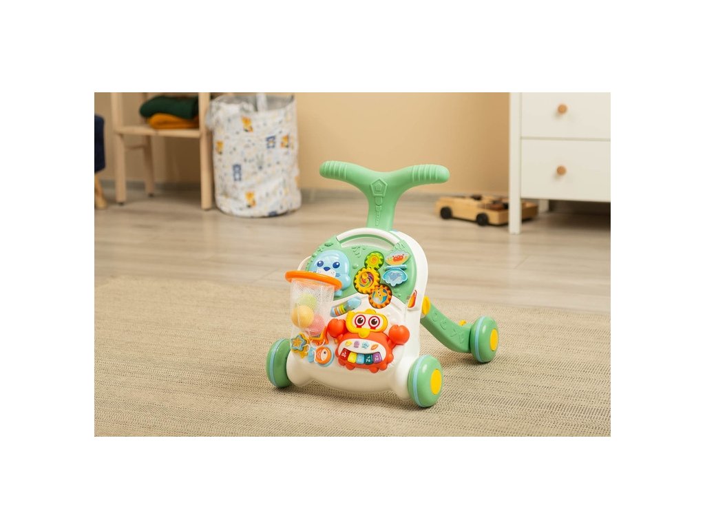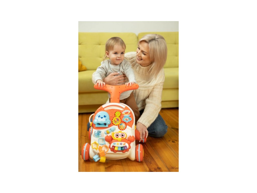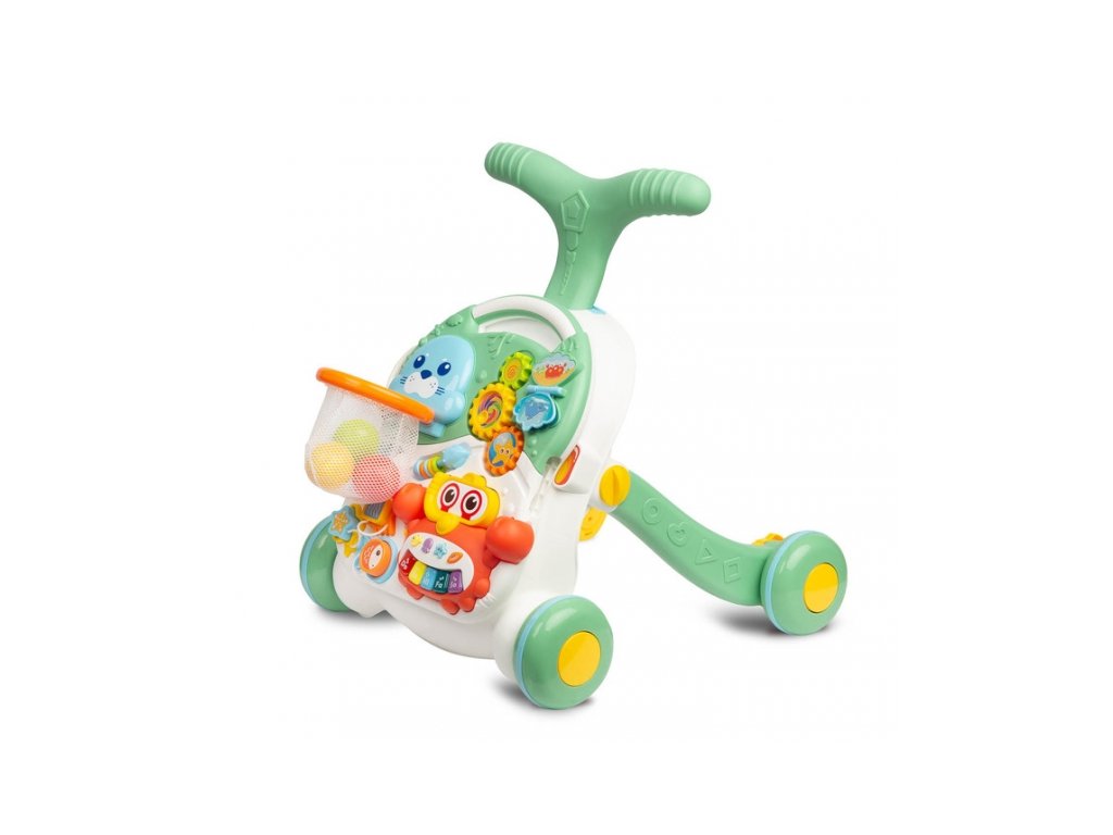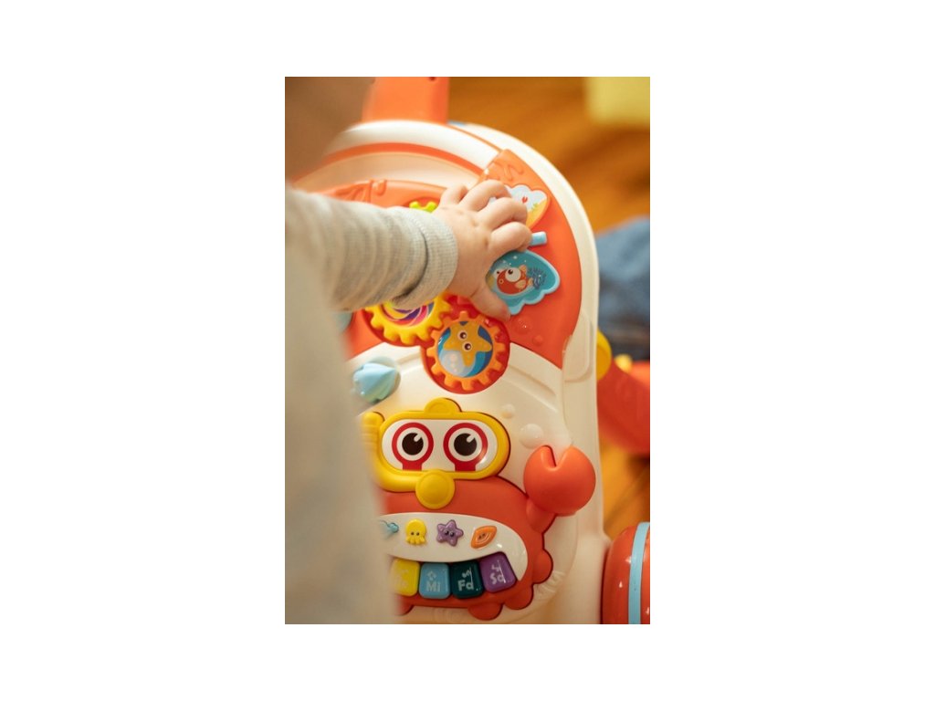 Dětské interaktivní chodítko, stoleček s příslušenstvím 2v1.Vzdělávací hračka z řady TOYZ Activity, ideální pro dítě, které již začalo dělat první krůčky. Díky kombinaci několika možností v jedné hračce zabaví vaše batole na mnoho hodin. Dá se použít jako odstrkovadlo nebo interaktivní stůl se spoustou atrakcí. Čas zpříjemní košík, do kterého může vložit 3 plastové míčky s chrastítkem, bateriové a odnímatelné piano ve tvaru kraba, točící se ozubená kola a mnoho dalších překvapení. Přední panel lze sejmout a proměnit v hrací stolek.