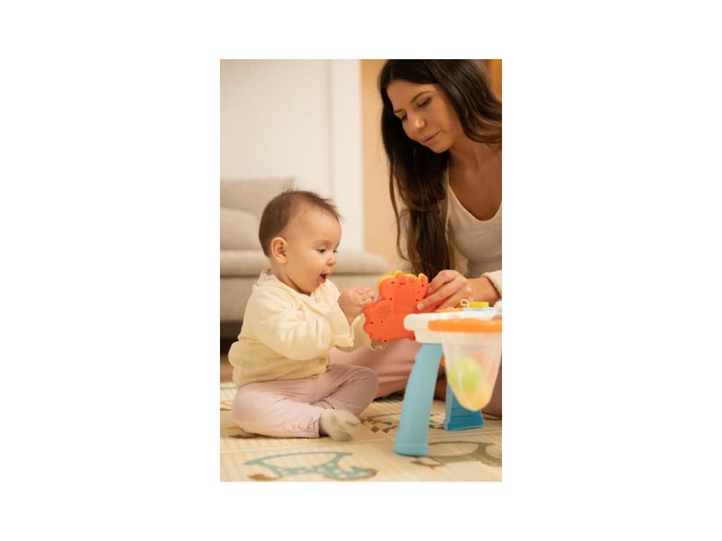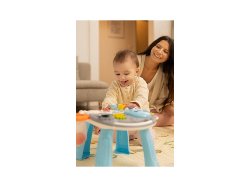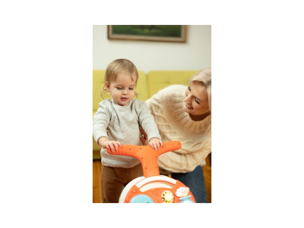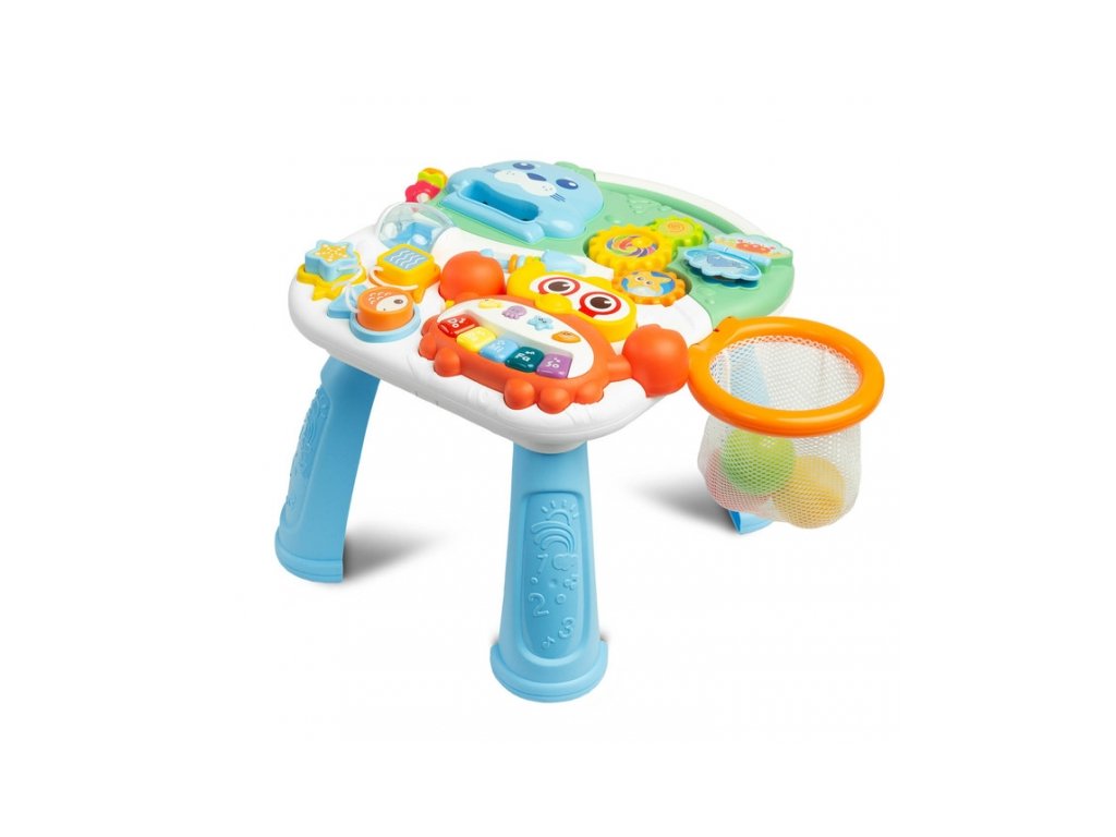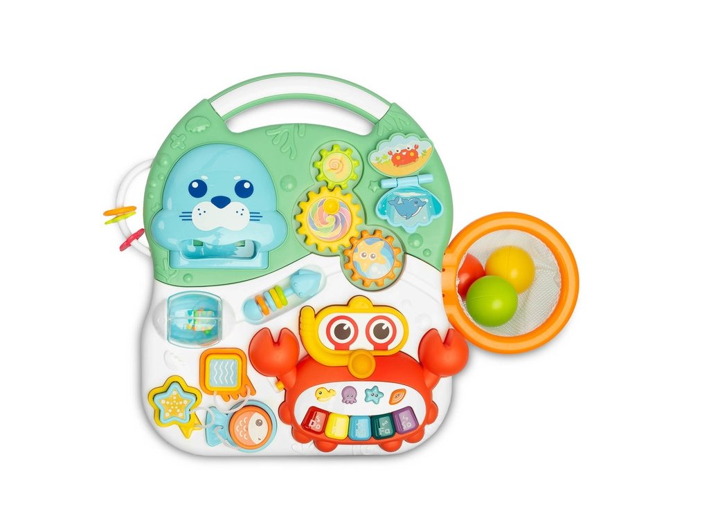 Dětské interaktivní chodítko, stoleček s příslušenstvím 2v1.Vzdělávací hračka z řady TOYZ Activity, ideální pro dítě, které již začalo dělat první krůčky. Díky kombinaci několika možností v jedné hračce zabaví vaše batole na mnoho hodin. Dá se použít jako odstrkovadlo nebo interaktivní stůl se spoustou atrakcí. Čas zpříjemní košík, do kterého může vložit 3 plastové míčky s chrastítkem, bateriové a odnímatelné piano ve tvaru kraba, točící se ozubená kola a mnoho dalších překvapení. Přední panel lze sejmout a proměnit v hrací stolek.