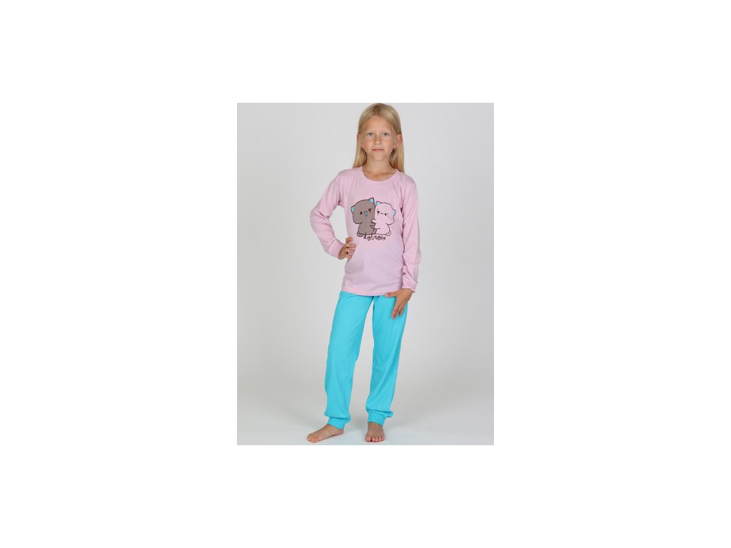 Pro příjemný spánek a dobrou noc děti potřebují spaní jako v bavlnce. Dětské pyžamo P MICKA z příjemné bavlny se skládá z růžového trika s dlouhým rukávem s potiskem koček a jednobarevných dlouhých pyžamových kalhot.