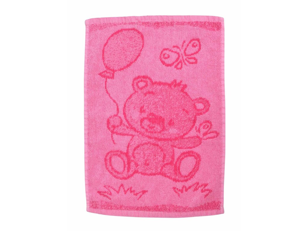 Růžový dětský ručník Bear s vetkaným motivem medvídka s balónkem a motýlků potěší každé dítě. Díky praktickému rozměru 30×50 cm je ideální na každodenní používání doma i ve školce.