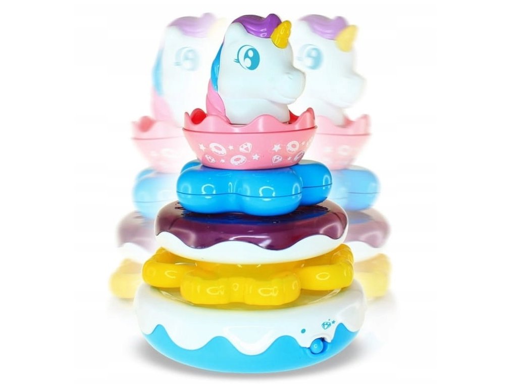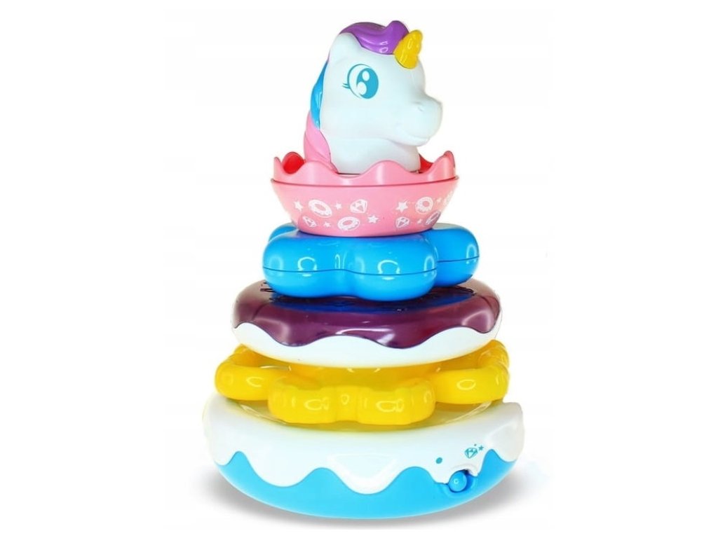 Balanční věž, pyramida . Bavte se s jednorožcem stavěním pyramidy z barevných kroužků a poslechem veselé melodie! Hraní při třídění nebo sladění správných prvků je především skvělou podporou pro rozvoj motorických schopností dětí a procvičování malých dětských prstíků. Další výhody: - učí logické myšlení - pohybující se základna ztěžuje umístění kroužků, proto dítě potřebuje trochu vymyslet, jak je vložit na základnu, aby se hračka po celou dobu nehýbala, což pro tak malé děti není tak snadné, - pomáhá při učení barev, vzorů a tvarů - okouzlující barvy a vzory používané nejen povzbudí batole hrát, ale také mu pomohou naučit se rozlišovat, - rozvíjí fantazii a kreativitu. Věk: 12 m+.Doplňkové parametry