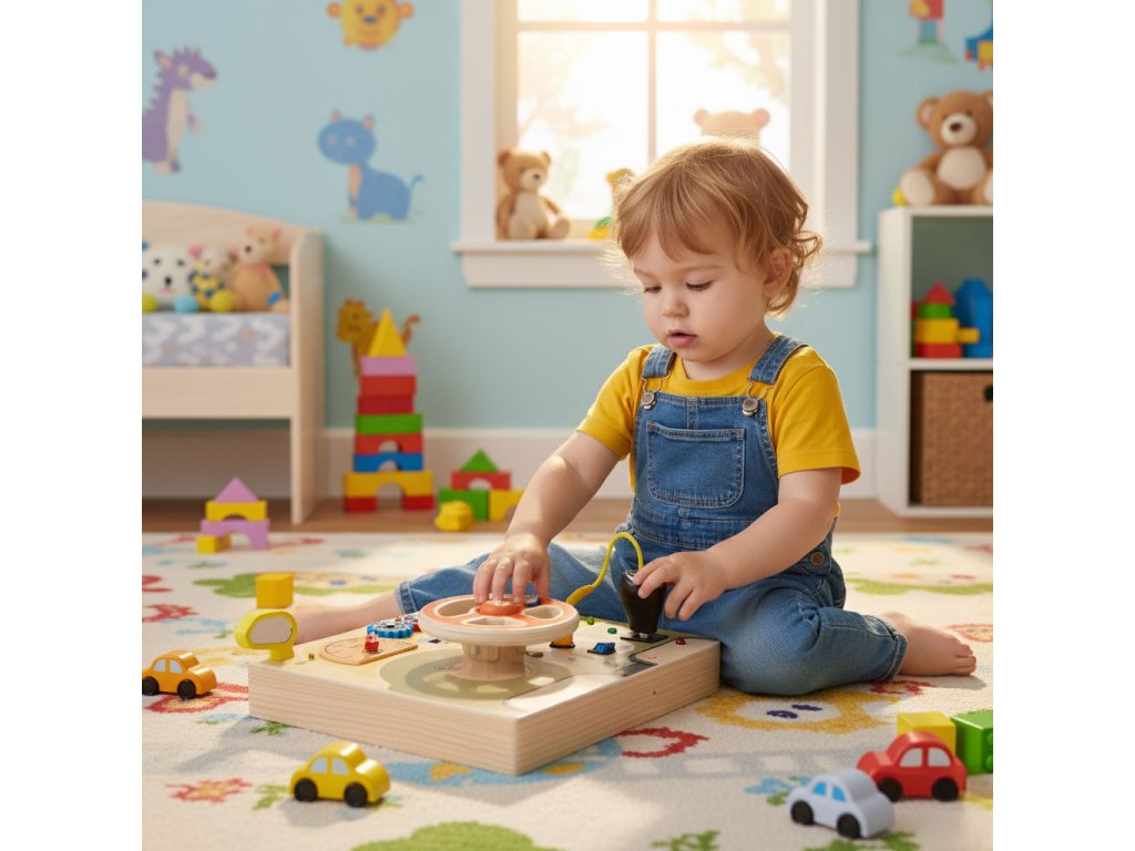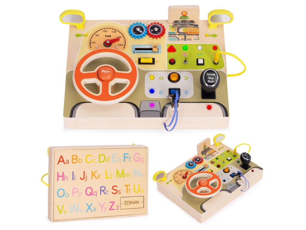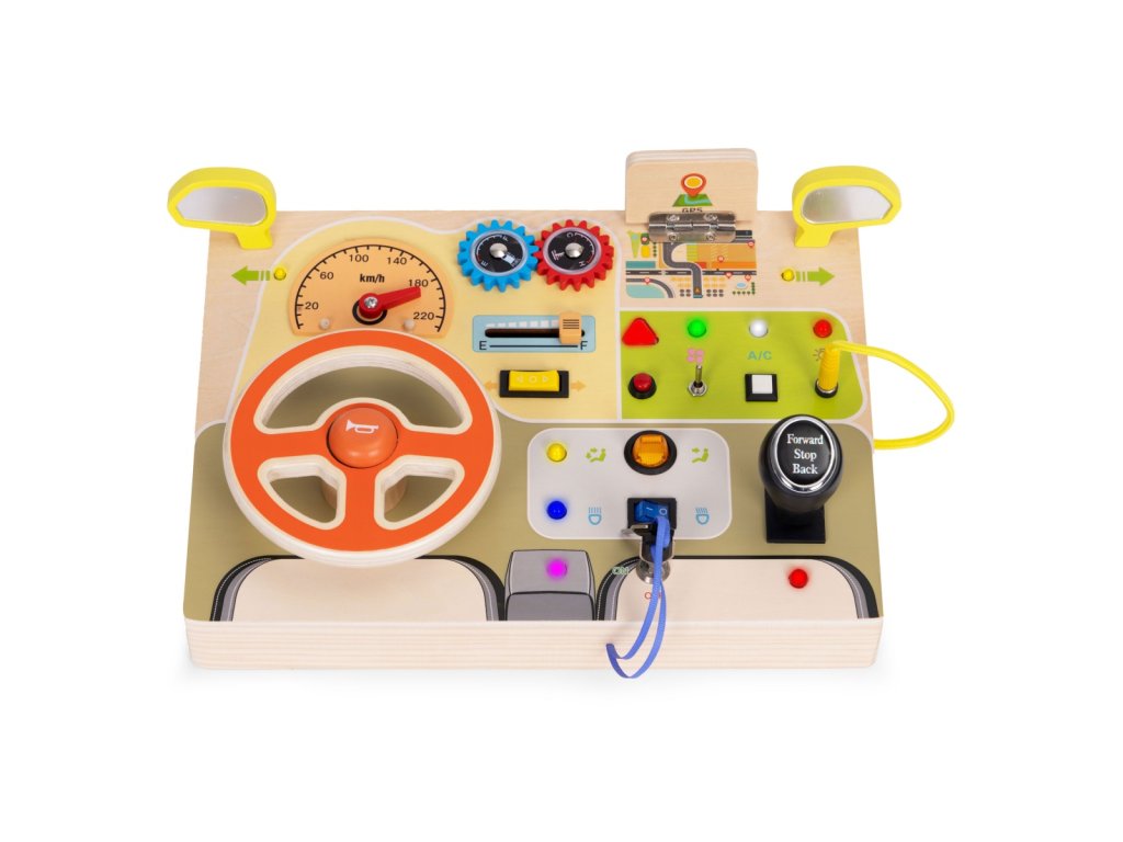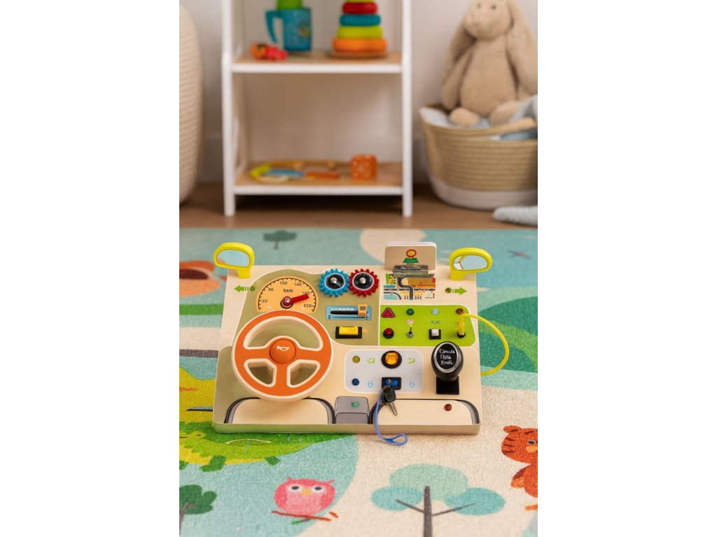 Dřevěná Montessori manipulační tabule pro děti LED senzorická, s volantem auta