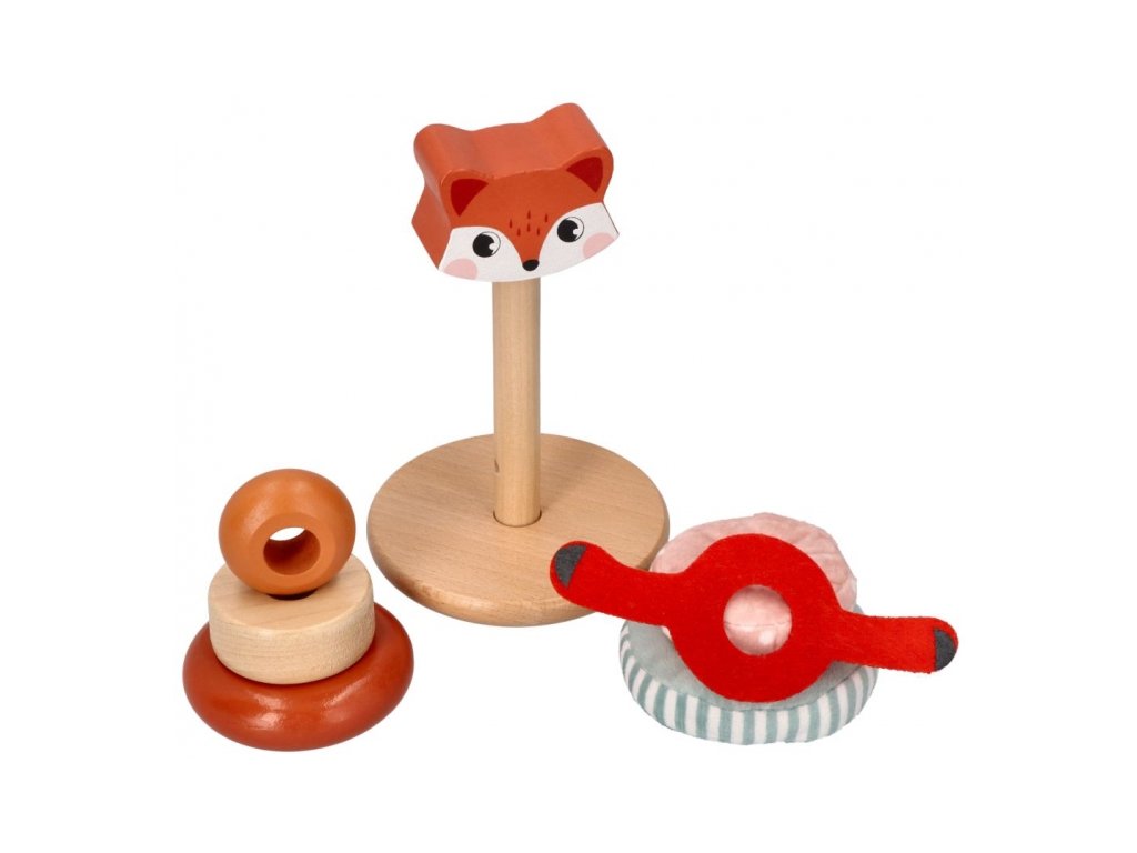 Krásná pyramida s motivem lišky od Adam Toys je klasickou dřevěnou hračkou pro každé batole.Dřevěné a látkové kotouče jsou umístěny na kůlu, aby vytvořily pyramidu. Díky základně oválného tvaru se to celé mírně hýbe a úkol je tak trochu obtížnější. Disky lze uspořádat mnoha způsoby.