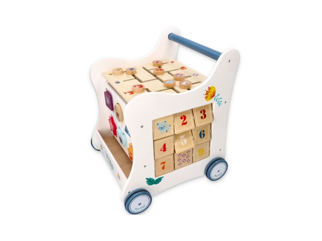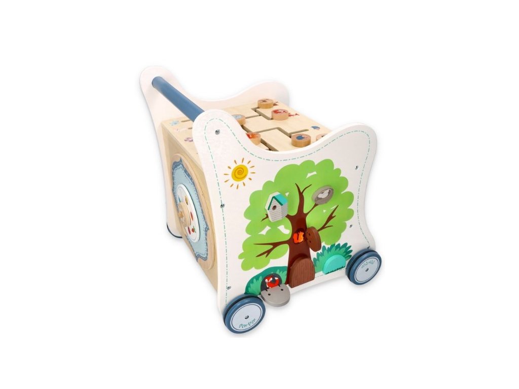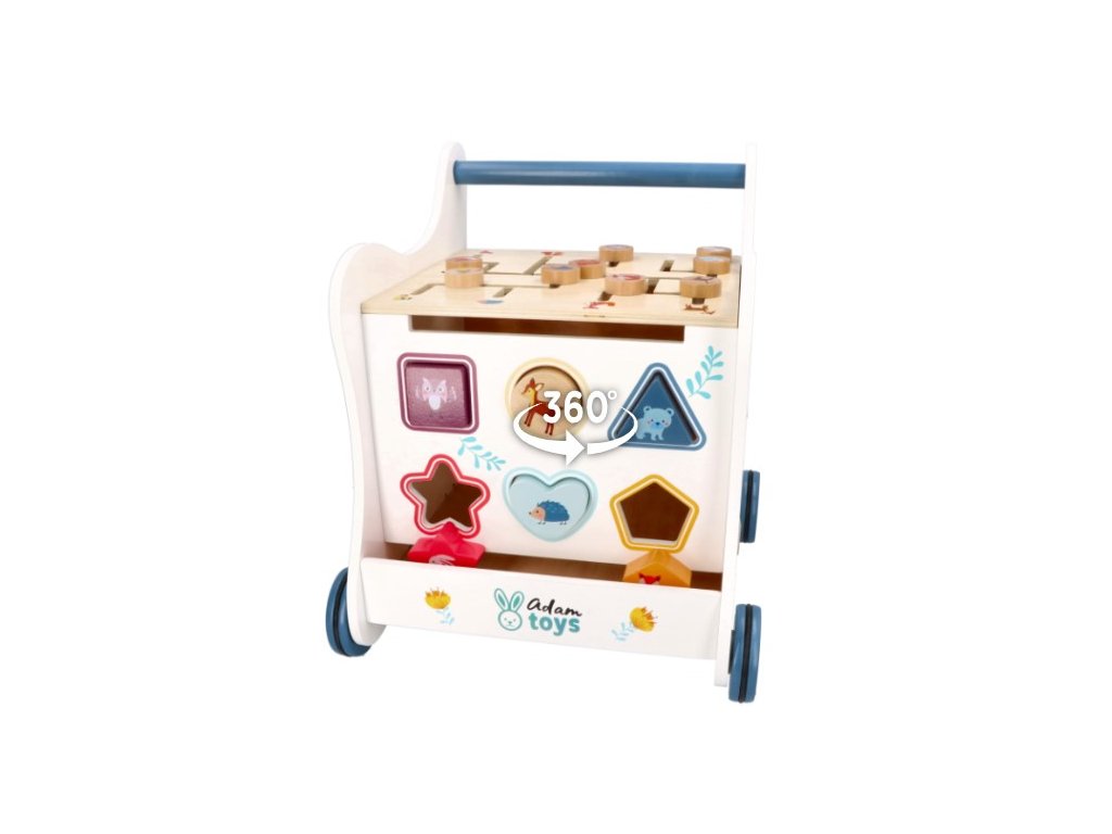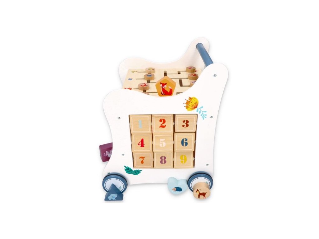 Dřevěné aktivní chodítko Lesní zvířátka. Tato fantastická hračka je ideální dárek pro vaše dítě. 1. Třídič se šesti bloky - díky třídění se dítě učí tvary a rozvíjí koordinaci ruka-oko ve snaze přiřadit tvar k otvoru. 2. Puzzle s čísly - dítě si umí seřadit čísla a na druhou stranu uvidí přesně tolik zvířátek, kolik je na čísle. 3. Kolovrat, ze kterého zjistíte, co zvířátka jedí. Kolo má tři různé rotační vrstvy. První je ukazovací šipka, druhá je jídlo a třetí je s otvorem pro ukrytí zvířat. Například veverka jí žaludy a co jedí zbytek zvířat? 4. Kde zvířata žijí? Poslední stěna umožňuje zkontrolovat, které zvíře hledá úkryt ve vysoké trávě a které ve větvích stromů. 5. Bludiště v horní části umožňuje spárování zvířat ve dvojicích. Úkolem dítěte je pohybem pohyblivého prvku dojet ho do dvojice. Rozměry produktu: - Rozměry ve složeném stavu: 36 x 37 x 43 cm. - Výška do rukojeti 41 cm - ideální pro roční dítě, které se učí chodit. - Rozměry balení: 44,5 x 37 x 12cm. Vhodné pro děti od 12 měsíců.Doplňkové parametry