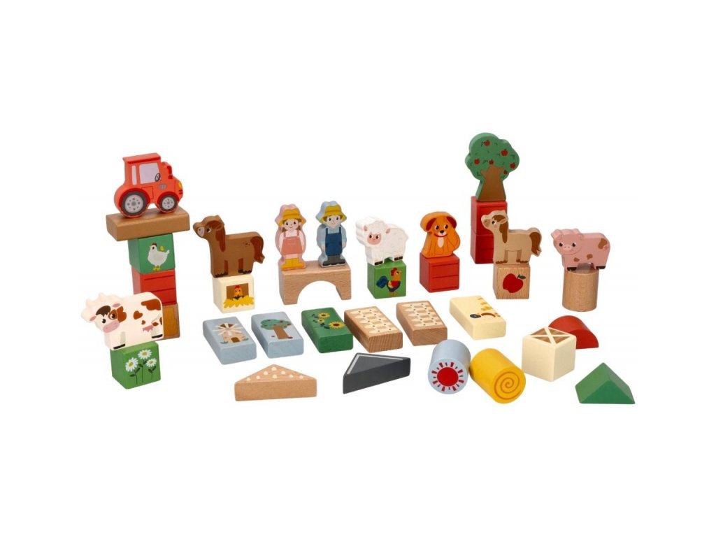 Nechte malého farmáře vyhrnout si rukávy, protože ho čeká spousta práce:)Velká sada skládající se z 36 dřevěných kostek různých tvarů a velikostí umožňuje různé stavby. Bloky jsou zdobeny motivem farmy, který vytváří ucelený celek, zavádějící děti do světa hospodářských zvířat. Dítě si díky hře rozvíjí koordinaci ruka-oko a povídáním o tom, co vidí, si rozšiřuje slovní zásobu.