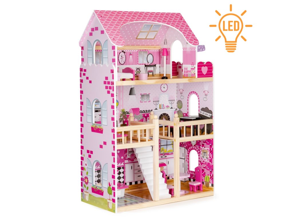 Dřevěný domeček pro panenky LED ECOTOYS. Pro děti od 3 let. 3 nezávislá patra na hraní. 5 výrazných místností. S LED osvětlením. Z vysoce kvalitního dřeva. Věrná kopie skutečného domu. Tvarovaná střecha pro pohodlné hraní. Součástí je sada 17 dřevěných kusů nábytku. Bez ostrých a nebezpečných hran. Rezidence Maryland. Rezidence Malinowa je bez pochyb ten nejlepší dárek, který můžete dopřát svému dítěti. Snem každé holčičky je, aby si mohla hrát se svými panenkami v krásném připraveném domečku. Domeček pro panenky značky ECOTOYS vděčí své kouzlo promyšlené barevnosti a pečlivě navrženým místnostem. Díky tomu se rezidence skvěle vyjímá nejen v dětském pokoji, ale i v obýváku, kde zaujme celé rodině dech. Skvělá zábava. Stačí chvilka a děti si domeček zamilují. Celý domeček má 3 nezávislá patra a dohromady 5 místností, které věrně připomínají skutečný rodinný dům. Každá místnost je v jiném stylu, s nábytkem a dekoracemi laděnými k jejímu účelu. Nic ale nebrání tomu, aby se vaše dítě stalo malým designérem a vše si uspořádalo podle sebe. Součástí balení je také komplet 17 dřevěných kusů nábytku, které lze libovolně vyjímat a přemisťovat bez omezení. V sadě 17 barevných kousků nábytku. Stůl + 2 židle. Pohovka a kávový stolek. Sporák s otevíracími dvířky. Vana, toaleta, umyvadlo se zrcadlem. Piano a stolička. Postel, noční stolek a taburet. 3 stojací lampy. Rozměry. Šířka: 59 cm. Hloubka: 30 cm. Výška: 90 cm. Specifikace. Pro děti od 3 let. Počet kusů nábytku: 17 kusů. Hmotnost: 11,94 kg. Rozměr balení: 73,5 x 39,5 x 23,5 cm. Výrobce: ECOTOYS. Upozornění: Nevhodné pro děti do 3 let. Obsahuje malé části, nebezpečí spolknutí nebo vdechnutí. Obal není hračka, odstraňte ho z dosahu dítěte. Nenechávejte dítě při hře bez dozoru. Dbejte pokynů výrobce a návodů k montáži. LED osvětlení používejte pod dohledem dospělé osoby.Doplňkové parametry