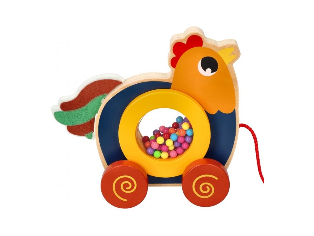 Tento pěkný dřevěný kohoutek poskytne vašemu dítěti nejen mnoho příležitostí ke hře, ale také podpoří rozvoj motorické koordinace a motorických dovedností. Batolata milují tahat něco za sebou, a čím více (a hlasitější) to je, tím častěji a ochotněji se naše dítě začne pokoušet samostatně chodit.Tato hračka vám jistě zpříjemní každou společnou procházku díky barevným míčkům, které se při tahu točí. Čím rychlejší je tempo chůze, tím rychleji se míčky otáčejí.