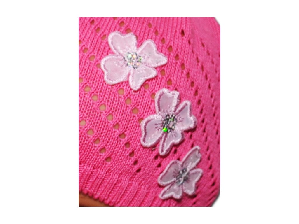 Háčkovaná čepička Baby Nellys ® s kytičkami. Ideální na jarní i letní nošení. Čepička je měkkoučká, jemná, dobře se nosí. Materiál: 50% bavlna, 50% akryl. 1. Jakost. Rozměr čepičky - obvod hlavičky - 38 - 42cm. Hloubka cca 16cm.Doplňkové parametry