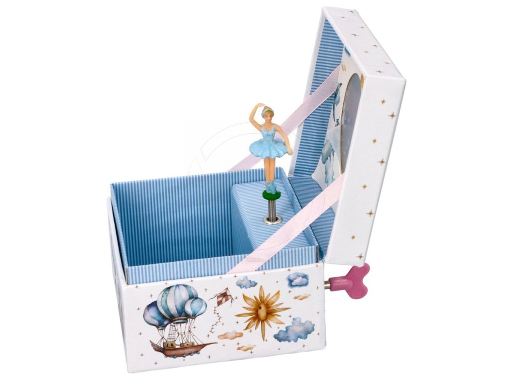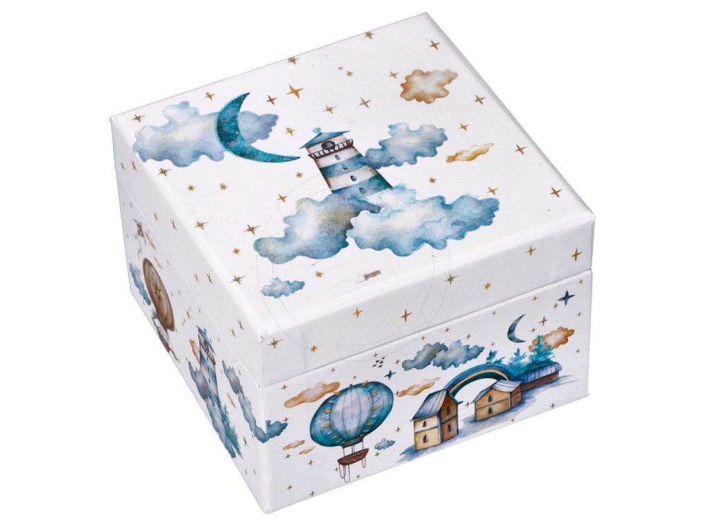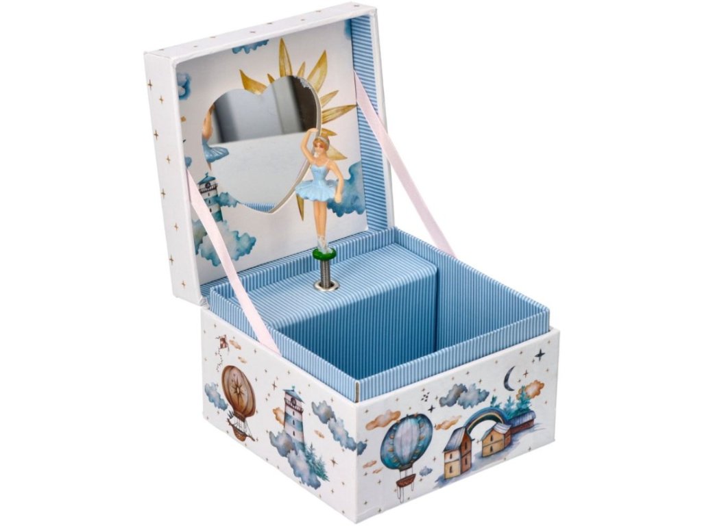Hrací skříňka. Hrací skříňka s tématem říše snů - po jejích stranách najdete mraky, měsíc a maják. Doplňkem je malá vesnice a balónová vzducholoď s třpytivými hvězdami viditelnými v pozadí. Měsíc zdobený třpytivými zelenomodrými třpytkami dodává hrací skříňce jemnou, ale ne příliš přehnanou jiskru. V hlavní roli krásná, třpytivá baletka ve všech barvách duhy. Pestrobarevná hrací skříňka s jemným brokátovým zdobením, balerína točící se na hudbu For Eliza. Mechanismus nevyžaduje baterie - je navinutý, stačí otočit knoflíkem na zadní straně hrací skříňky, uvnitř zrcadlo ve tvaru srdce, z vyztuženého kartonu. Upozornění: Výrobek není hračka, jedná se o dekorativní předmět. Vhodné pro děti od 6 let.Doplňkové parametry