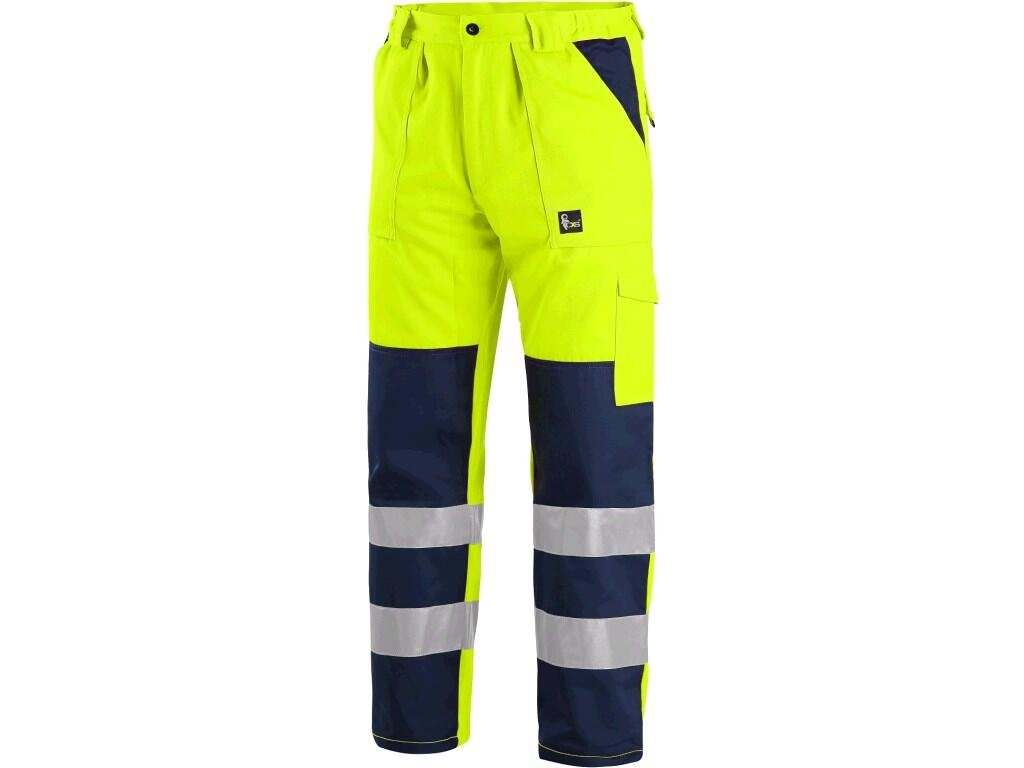 Pánské výstražné kalhoty, pas s poutky na opasek a gumou v bocích, 2 přední kapsy, 2 zadní kapsy, kryté přední zapínání na zip, levá boční kapsa s menší kapsou na tužku, 3M reflexní pásky (šíře 7 cm). Doporučené použití: stavebnictví, silničáři, řidiči, údržba, logistika, letecká a lodní doprava, popeláři, záchranáři.