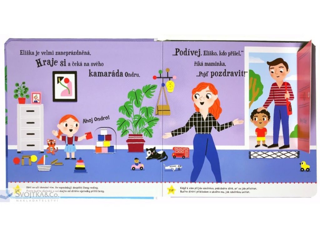 Tato kniha je skvělý pomocník pro seznámení dítěte s různými situacemi a způsoby, jak se při nich zachovat. Obsahuje pohyblivé prvky a odborné rady pro rodiče. Eliška se moc těší na svého kamaráda Ondru. Umí už návštěvu přivítat? Umí se s kamarádem podělit o hračky? S pomocí této knihy můžete učit své dítě, jak být slušný. Kniha plná pohyblivých prvků obsahuje na každé dvoustraně radu pro rodiče. Umět poděkovat, o něco požádat, odnaučovat se zlozvyky, podělit se a být milý na návštěvu patří mezi základy slušného chování. Začít si je osvojovat může dítě třeba hned teď. Rozměry: 190 x 190 mm, počet stran: 10. Videonávod najdete ZDE: ZDEDoplňkové parametry