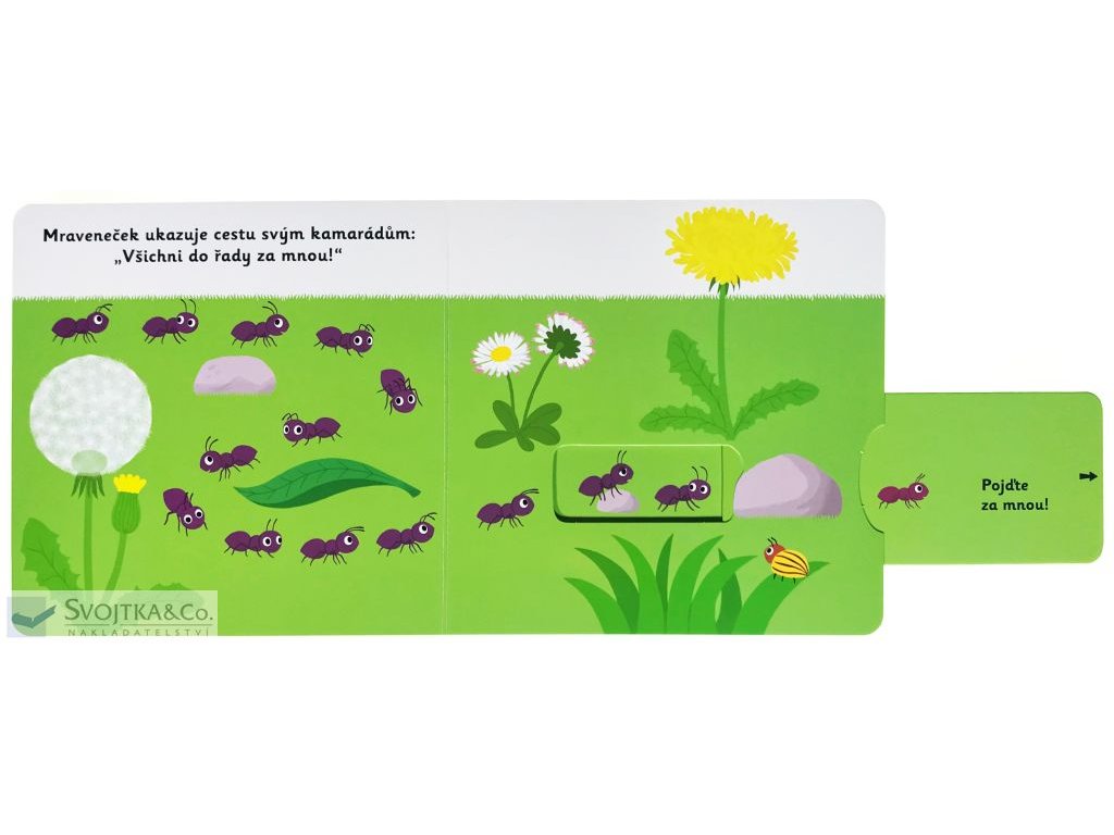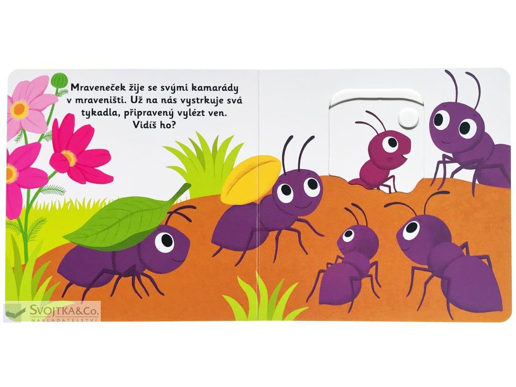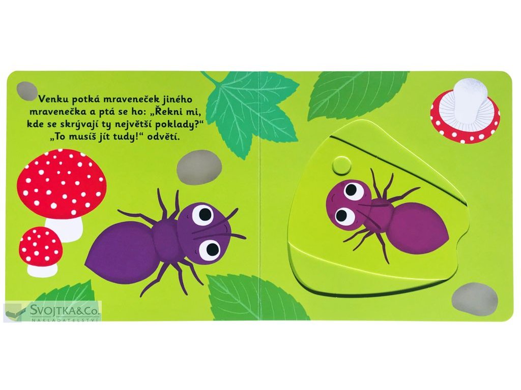 V mraveništi mají všichni napilno! Sleduj mravenečka během jeho výpravy z mraveniště a užij si s ním spoustu zábavy. Mravček vystrčil tykadlá z mraveniska a už beží objavovať a preskúmavať okolie. Všetci mravce usilovne pracujú a náš mraveneček pomáha ostatným nájsť správnu cestu a doniesť do mraveniska zaujímavé poklady. Objavovať svet s týmto leporelo pre najmenšie deti od jedného roka je tak zábavné! Pevné stránky s pohyblivými prvkami precvičia aj jemnú motoriku. Stačí len vložiť prstík do správneho otvoru a ľahko vysunúť, zatiahnuť alebo otočiť a hneď bude váš malý objaviteľ poznať odpovede. rozměry: 169 x 170 mm počet stran: 12Doplňkové parametry