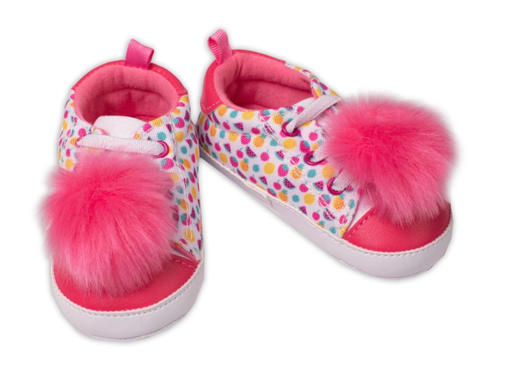 Dětské botičky s potiskem ovoce a velkou chlupáčkou bambulkou. Roztomilé dívčí botičky v růžové barvě s motivem ovoce. Ideální pro každodenní styling. Spodní podrážka je měkká. Botičky jsou lehké a pohodlné. Vnitřek je podšitý bavlnou, která je pro miminka nejbezpečnější a nejšetrnější. Nazouvání je na elastickou tkaničku. Materiál: vrchnní část: 80% bavlna, 20% polyuretan podrážka: 100% polyester vnitřní část: 100% bavlna Rozměry: 3-9 měsíců - délka cca 11,5 cm. 9-15 měsíců - délka cca 13 cm.Doplňkové parametry