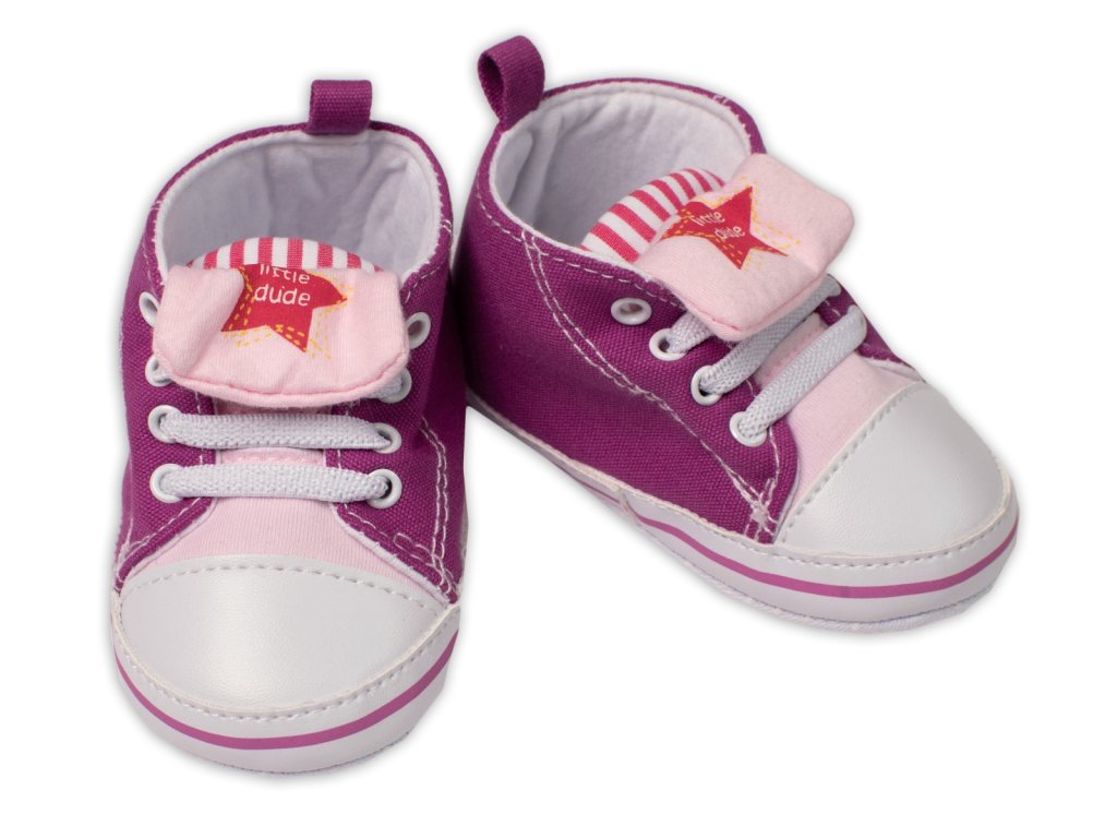 Dětské stylové moderní botičky s ozdobným přehybem Star. Roztomilé dívčí botičky ve fialové barvě.. Ideální pro každodenní styling. Spodní podrážka je měkká. Botičky jsou lehké a pohodlné. Vnitřek je podšitý bavlnou, která je pro miminka nejbezpečnější a nejšetrnější. Nazouvání je na elastickou tkaničku. Materiál: vrchnní část: 80% bavlna, 20% polyuretan podrážka: 100% polyester vnitřní část: 100% bavlna Rozměry: 3-9 měsíců - délka cca 11,5 cm. 9-15 měsíců - délka cca 13 cm.Doplňkové parametry