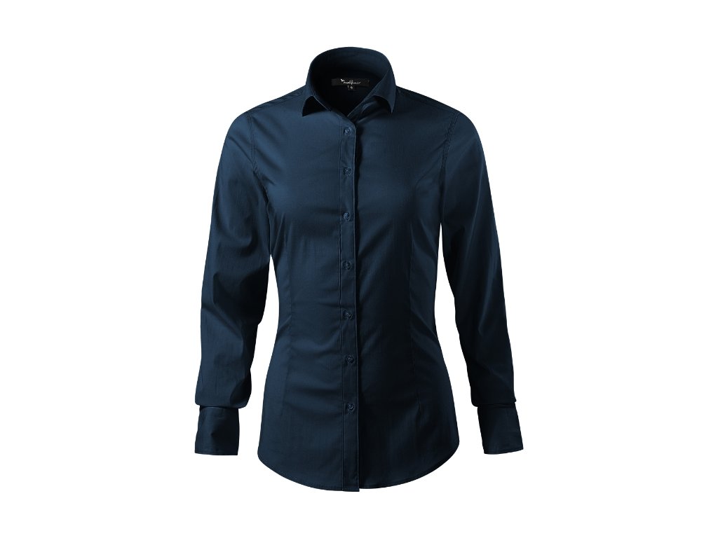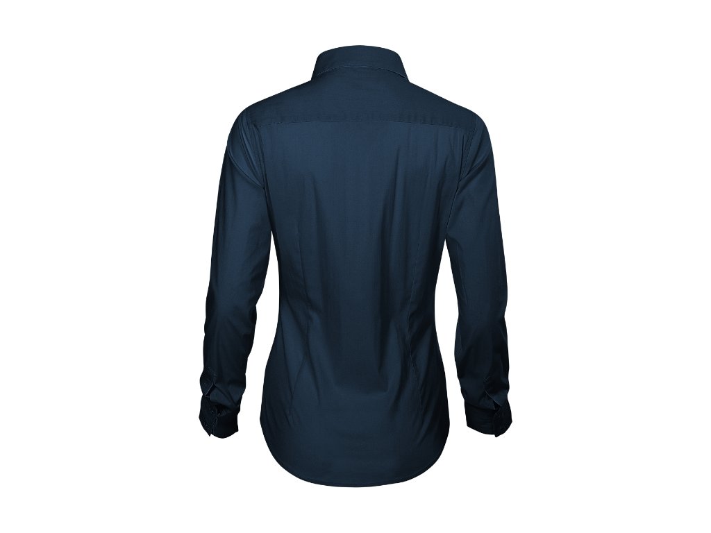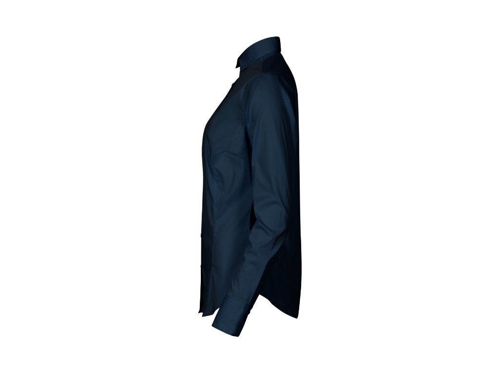 jemný strečový materiál projmutý střih s bočními švy dvojité sedlo na zadním dílu pasové a prsní záševky dvoudílný košilový límec přední kraje začištěny légou dlouhé rukávy s šikmou manžetou na 2 knoflíčky perleťové knoflíčky v barvě materiálu (1 náhradní navíc) tvarovaný dolní krajPlátnová vazba, 68 % bavlna, 29 % polyamid, 3 % elastan