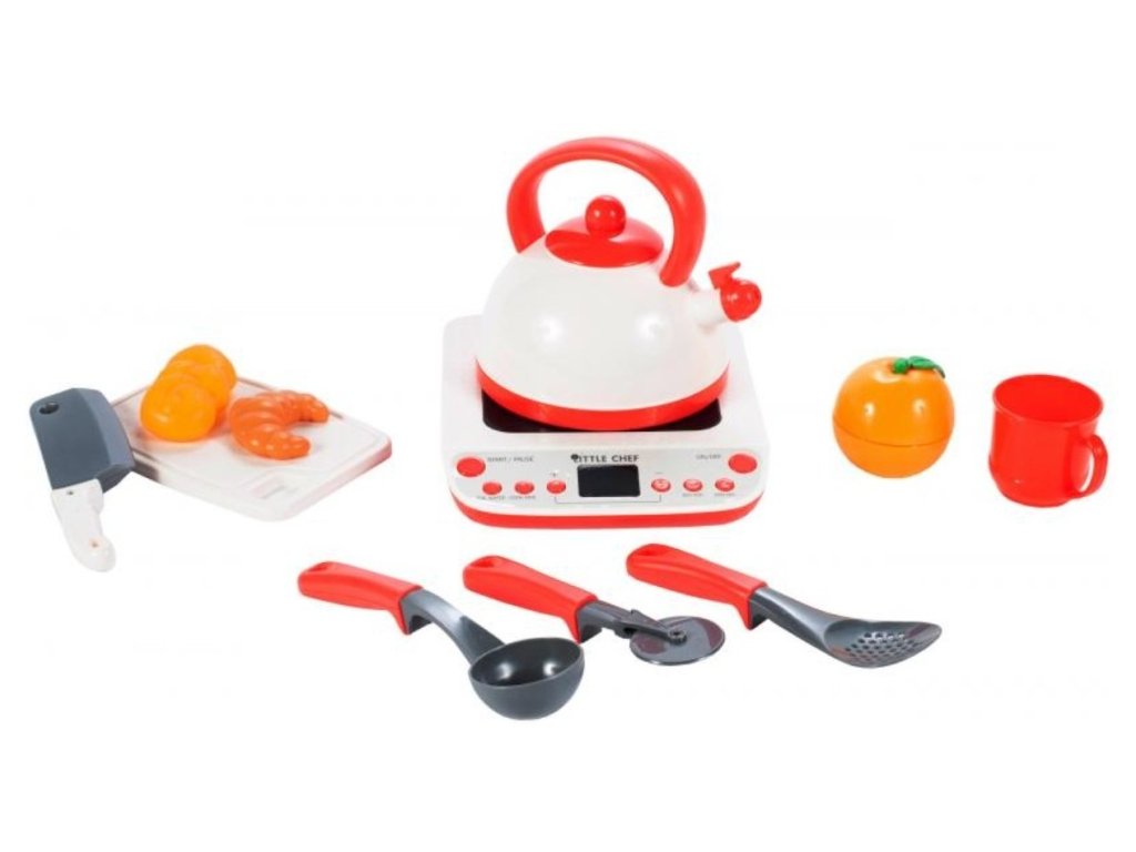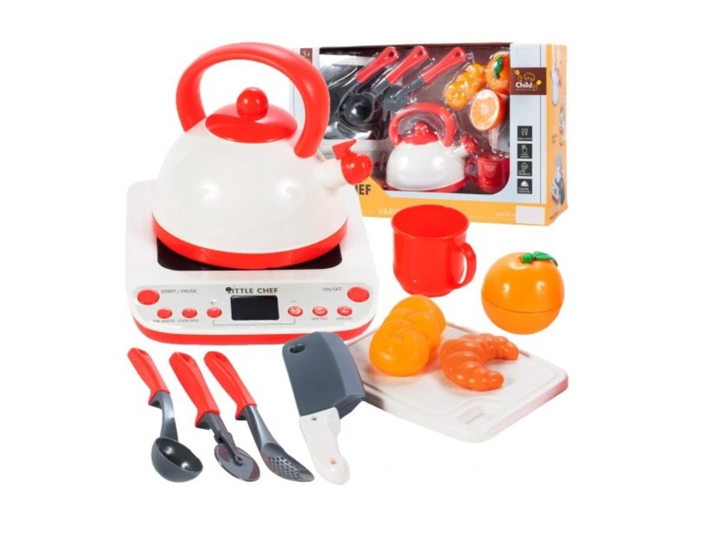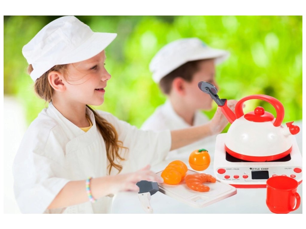 Kuchyňská sada. Sada na vaření s indukčním sporákem poskytne vašemu dítěti vlastní kuchyňský koutek. Malý kuchař bude mít možnost vaření a smažení na jedné indukční varné desce, která má 4 různé zvuky vaření. Produkt rozvíjí představivost a manuální dovednosti a přináší mnoho radosti s mnoha hodinami zábavy. Sada obsahuje: Indukční sporák na baterie, čajník, naběračku, sekáček, nůž na pizzu, obracečku, prkénko, hrneček, pečivo, ovoce. Po zapnutí tlačítka umístěného ve spodní části trouby se spustí zobrazení topné desky, díky čemuž bude naše batole moci ovládat nastavení teploty pomocí tlačítek na bocích displeje. Napájení 3 x AA - není součástí dodávky.Doplňkové parametry