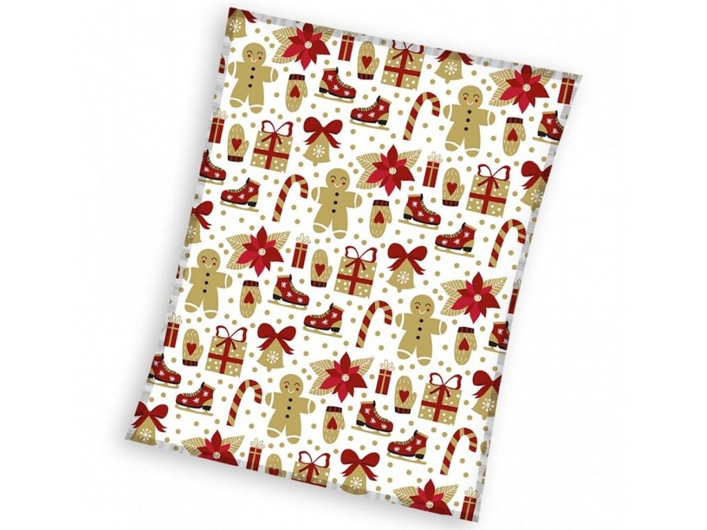 Mikroflanelová hřejivá deka s vánočním motivem je ideální volbou pro zimní období. Rozměr 150x200 cm poskytuje dostatek prostoru pro pohodlné zachumlání. Na bílém podkladu jsou rozesety dárečky s červenými stuhami, perníčci, vánoční punčochy, cukrové hůlky, zlaté tečky a červené květy poinsettie, které dodávají dece slavnostní a radostný vzhled.