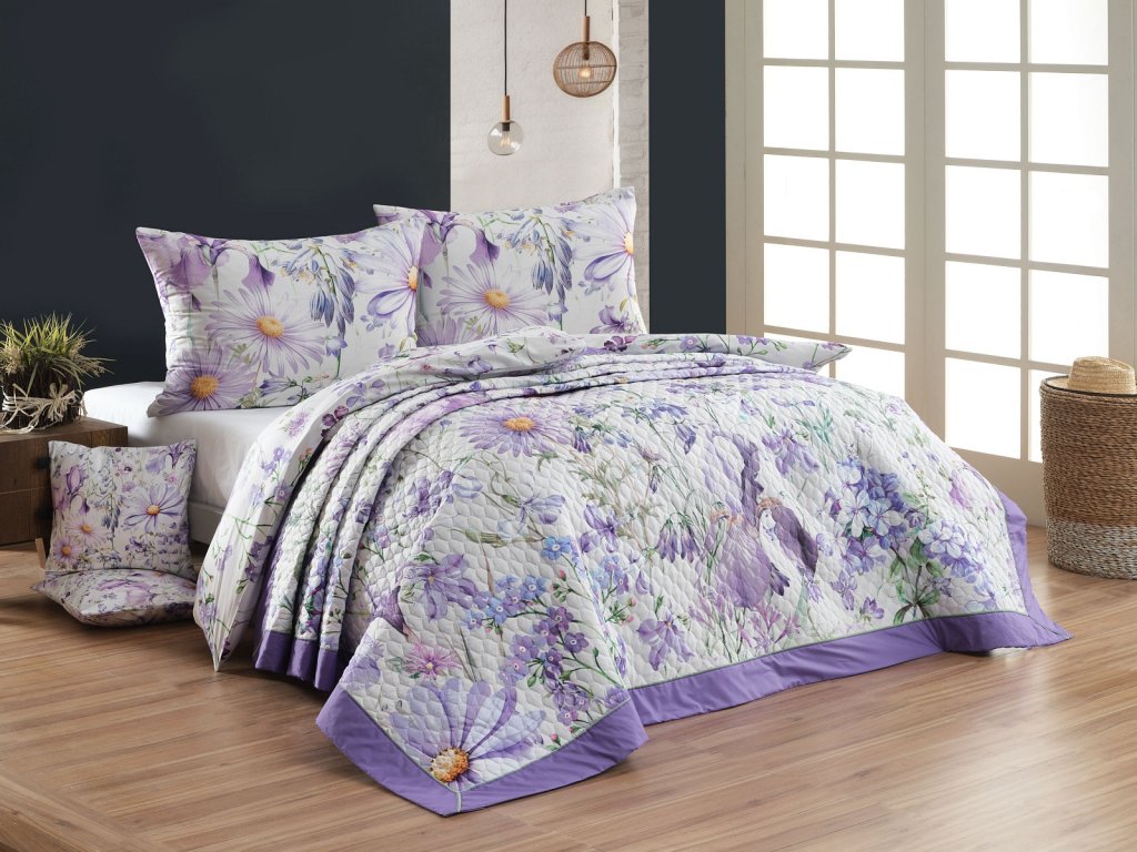 Barevné provedení: Atraktivní květinový vzor v paletě fialových a světle modrých tónů, který je z obou stran přehozu stejný. Okraje zdobí fialové lemování doplněné na vrchní straně sytě zelenou paspulí.