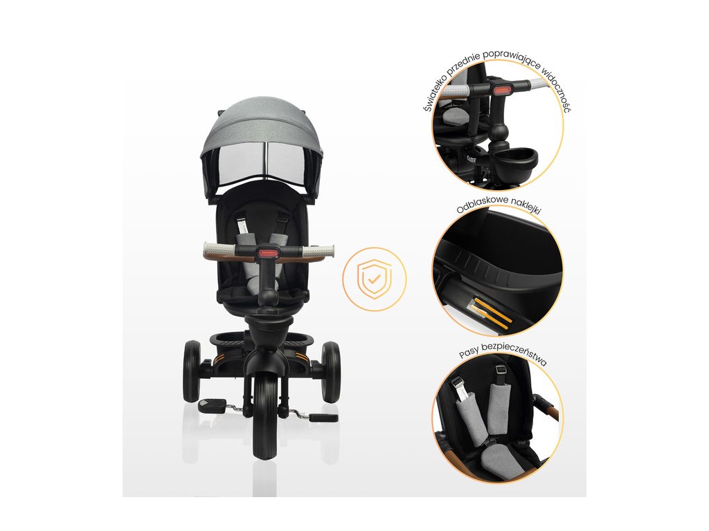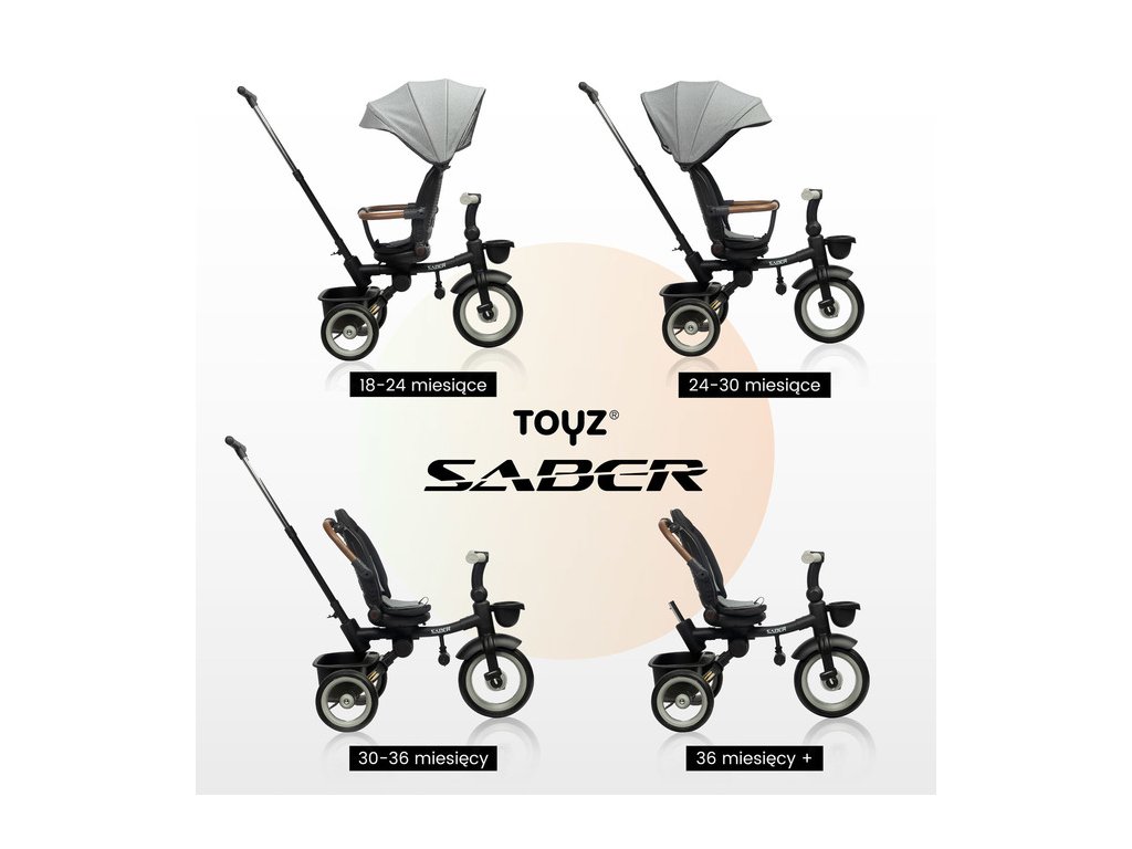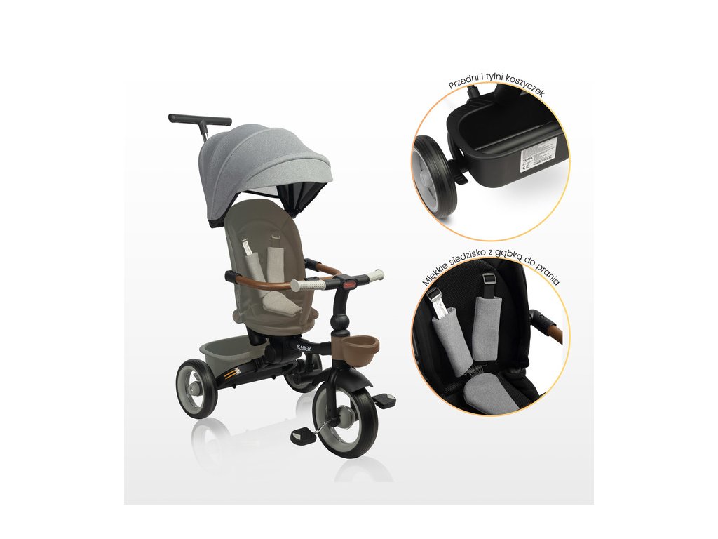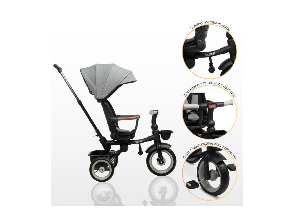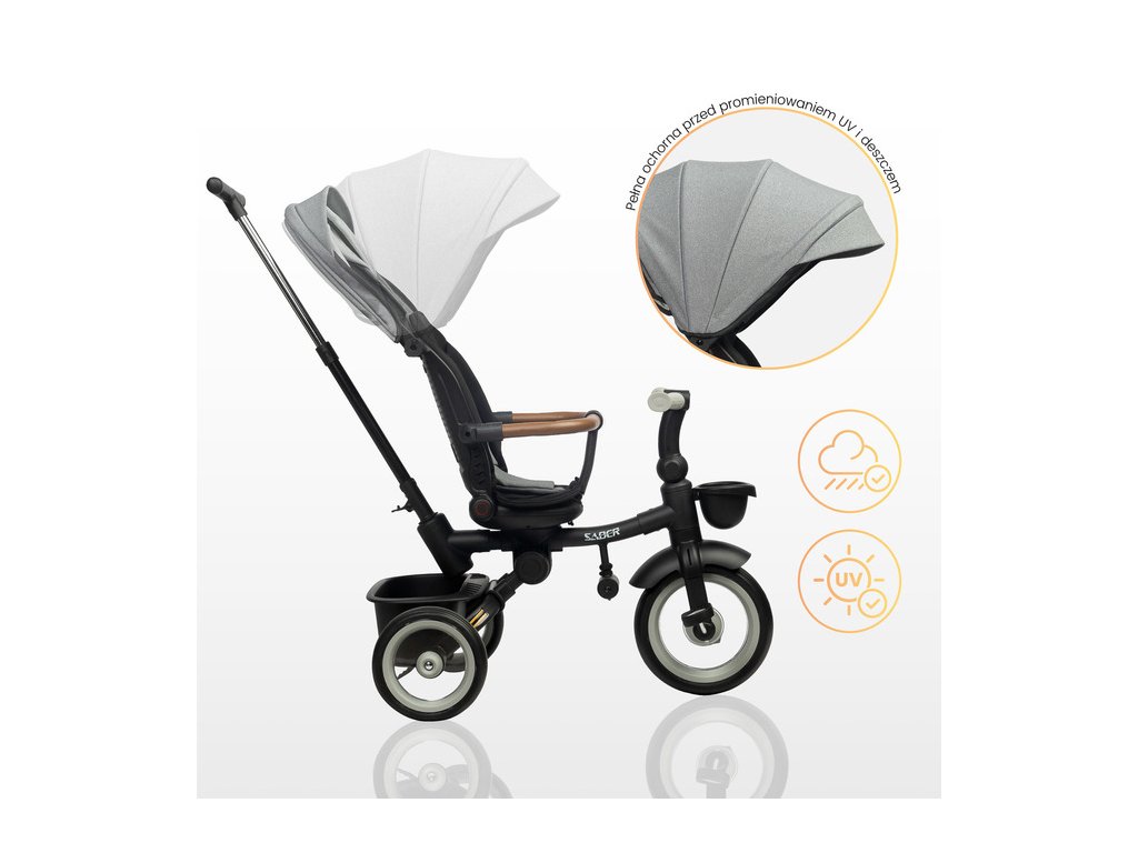 Multifunkční dětská tříkolka SABER: kvalita, bezpečnost a pohodlí. Dětská tříkolka SABER je ideální kombinací funkčnosti, bezpečnosti a moderního designu. Díky modulární konstrukci roste spolu s dítětem a je vhodná pro děti ve věku 3–5 let. Klíčové vlastnosti: Snadná ovladatelnost: Nastavitelná rukojeť pro rodiče zajišťuje pohodlné ovládání ve fázi učení. Komfort dítěte: Otočné sedátko s možností sklopení opěradla a ochranná stříška proti dešti a UV záření. Bezpečnost na prvním místě: 3bodové bezpečnostní pásy, ochranné madlo a odrazky pro vyšší viditelnost. Roste s dítětem: Odnímatelný podnožník a pedály přizpůsobené věku dítěte. Praktické detaily: Úložné koše na drobnosti vpředu i vzadu, snadno skládací konstrukce pro přepravu a skladování. Kvalitní konstrukce: Kovový rám a odolná PU kola zabraňující defektu. Tříkolka SABER poskytuje maximální pohodlí nejen dítěti, ale i rodičům díky přizpůsobitelné rukojeti a nezávislým nožním brzdám. Jednoduchý skládací mechanismus navíc umožňuje snadnou manipulaci a uskladnění. Bezpečnostní pokyny: Produkt je určen pro děti od 3 do 5 let s maximální nosností 25 kg. Dítě musí být vždy pod dozorem dospělé osoby a používat ochranné vybavení (helmu, chrániče). Objevte kvalitu a funkčnost dětské tříkolky SABER, která se stane skvělým společníkem na všech vašich rodinných výletech!Doplňkové parametry