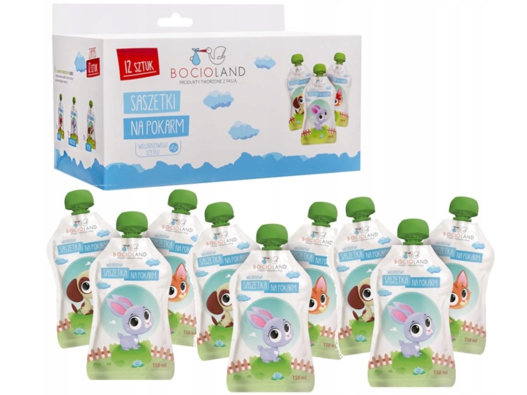 BocioLand Opakovaně použitelné potravinové sáčky, 150 ml. Speciálně navržená barevná grafika sáčků zaujme každé dítě, díky které je pro nás snazší zařadit na talíře mezi dětmi nepříliš oblíbené potraviny. Výhody krmení sáčky Bocioland: - Hygiena - krmení bez dotyku jídla špinavýma rukama. - Praktičnost - krmení bez lžičky, talířku nebo hrnečku. - Pořádek - krmení bez nepořádku. - Správný vývoj – krmení samostatně, intuitivně a s radostí bez vaší pomoci – podpora rozvoje dovedností dítěte. - Úspora – zdravé jídlo pro dítě připravíte mnohem levněji a přebytek můžete zamrazit a podávat jindy. Charakteristika: - Produkt lze zmrazit. - Výrobek lze mýt v myčce na horní polici. - Výrobek se nesmí vařit. - Výrobek plníme chlazenými potravinami s max. teplota 40 °C. - Výrobek není vhodný pro sterilizaci v mikrovlnné troubě nebo vařící vodě. - Výrobek není vhodný pro ohřev v mikrovlnné troubě nebo troubě. - Výrobek se nesmí sušit na slunci, v bezprostřední blízkosti ohně nebo přímých zdrojů tepla. - Výrobek je zcela bezpečný. Balení: 12 ks.Doplňkové parametry