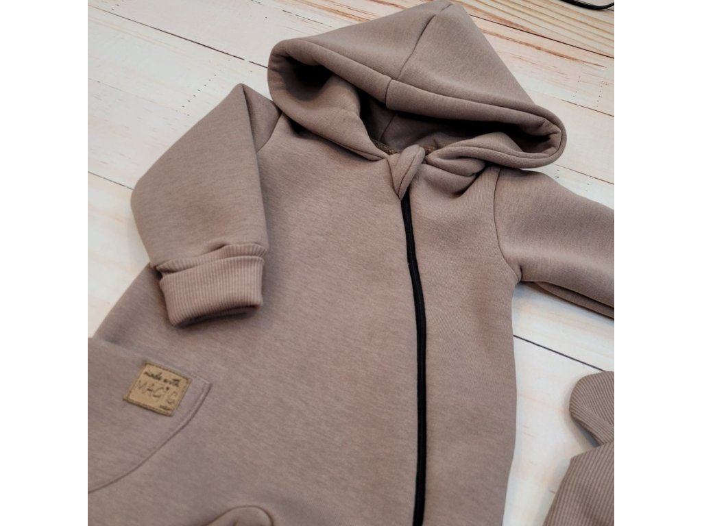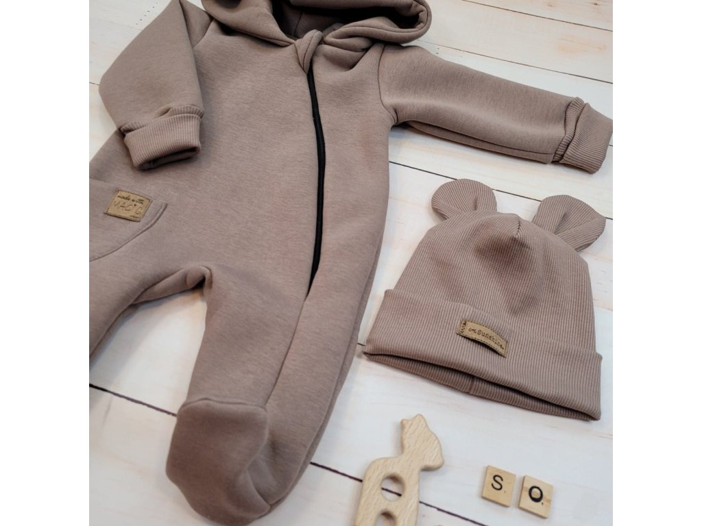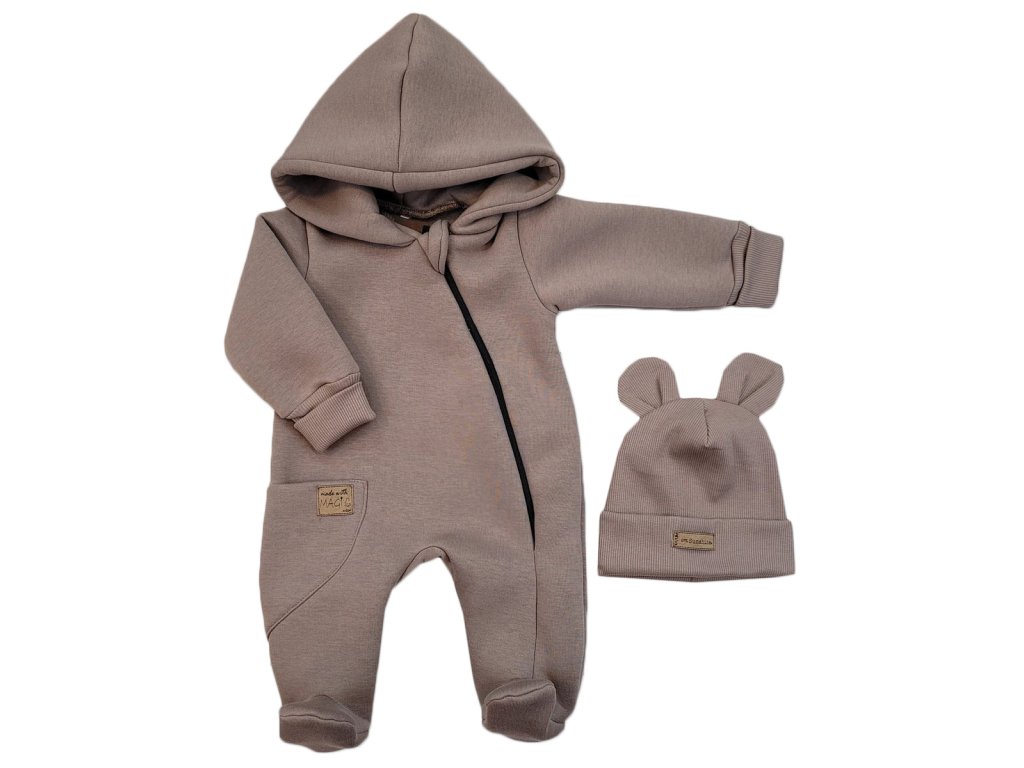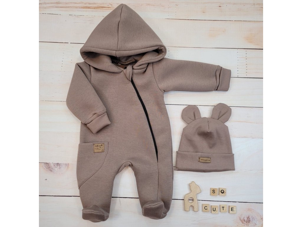Oteplený dětský overal se šlapkama a kapucí + čepička, 2D, Kazum, čokoládový