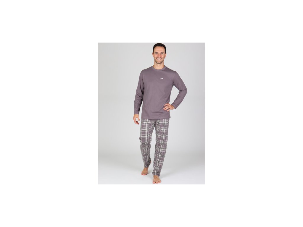 Pohodlné bavlněné pánské dlouhé pyžamo se skládá z jednobarevného trika s dlouhým rukávem a z dlouhých kalhot s károvým potiskem. Triko má na předním díle drobný potisk.