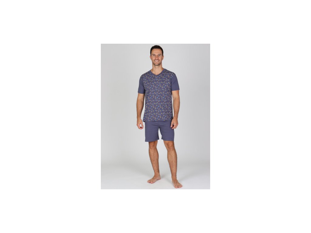 Pohodlné bavlněné pánské krátké pyžamo se skládá z trika s celoplošným potiskem a krátkých jednobarevných kalhot.