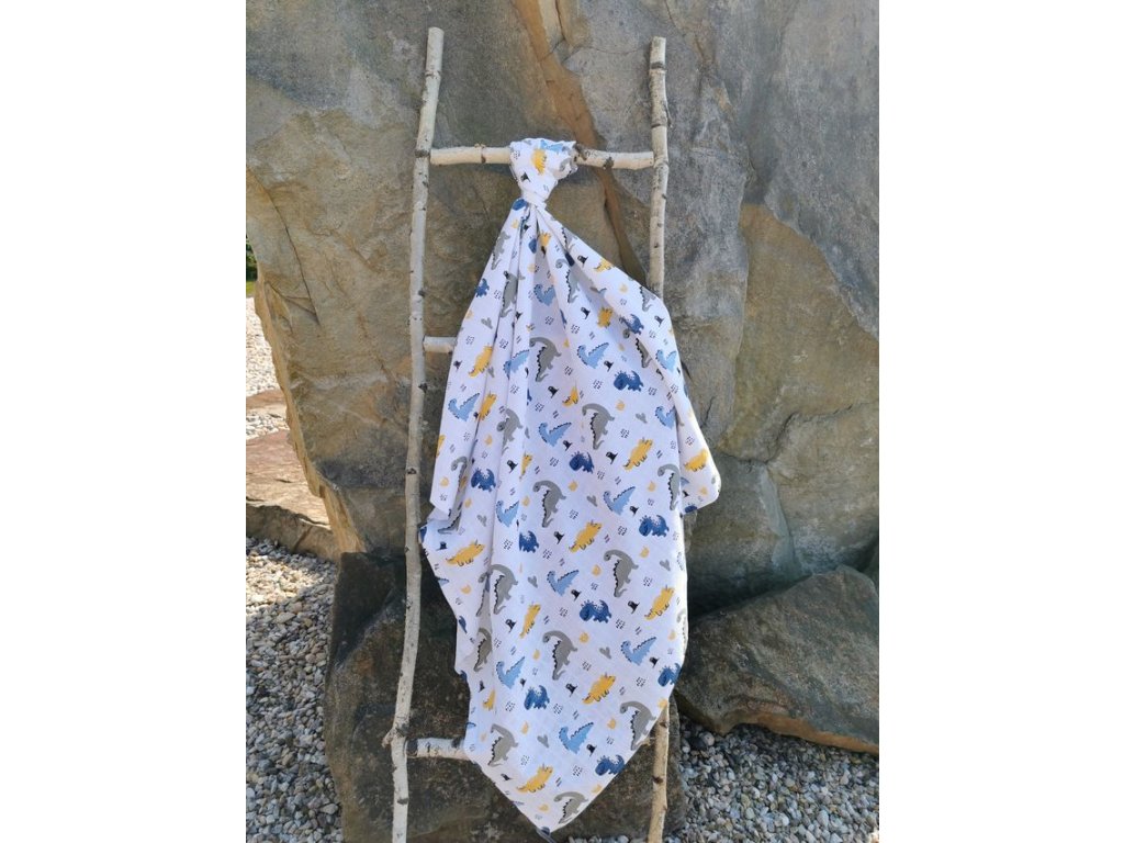 - jedná se o tetra plenu s motivem dinosaurů - plena je tkaná v klasické dutinné vazbě s typickou čtvercovou strukturou. Má dva okraje pevně vytkávané a dva pevně založené (což minimalizuje možnost třepení okrajů při praní a jejím používání)