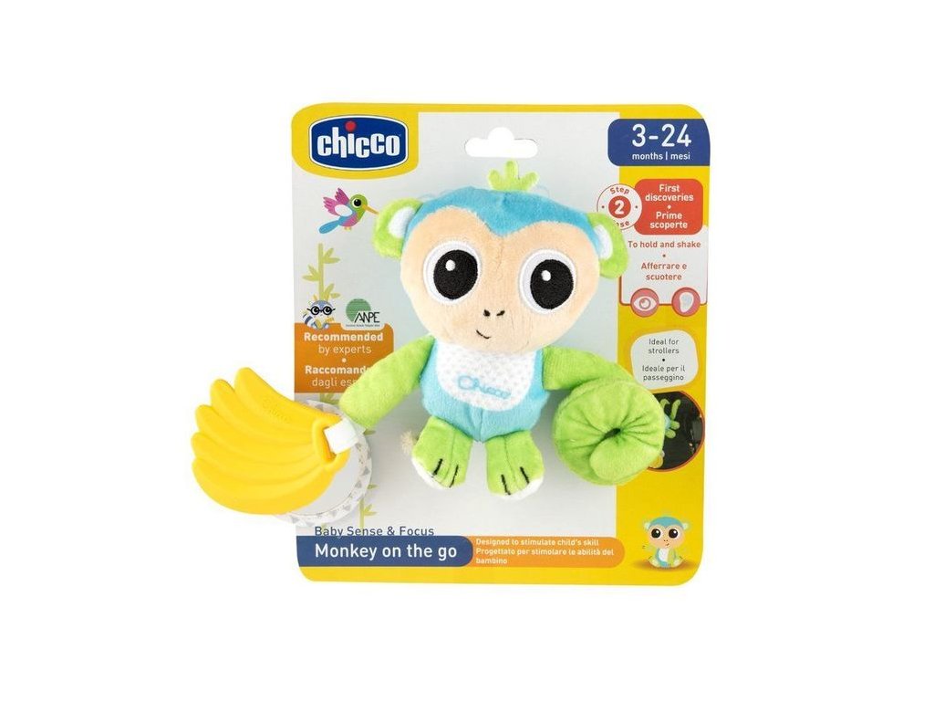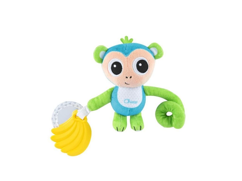 Veselá opička s chrastítkem Chicco. Tato rozkošná opice má dlouhou a pružnou tlapku, která vám umožní snadno ji připevnit na kočárek, kočárek nebo autosedačku a doprovázet vaše dítě v jakékoli situaci. Na druhé tlapce jsou dva přívěsky: kousátko ve tvaru banánu z měkkého plastu, které pomůže miminku v období prořezávání zoubků. Druhým přívěskem je zrcátko, které přitahuje pozornost dítěte pomocí světelných efektů. Uvnitř hračky je chrastítko, které navíc stimuluje zájem miminka. Vhodné pro děti od 3 měsíců. Rozměry balení: 14 x 15 x 5,5 cm.Doplňkové parametry